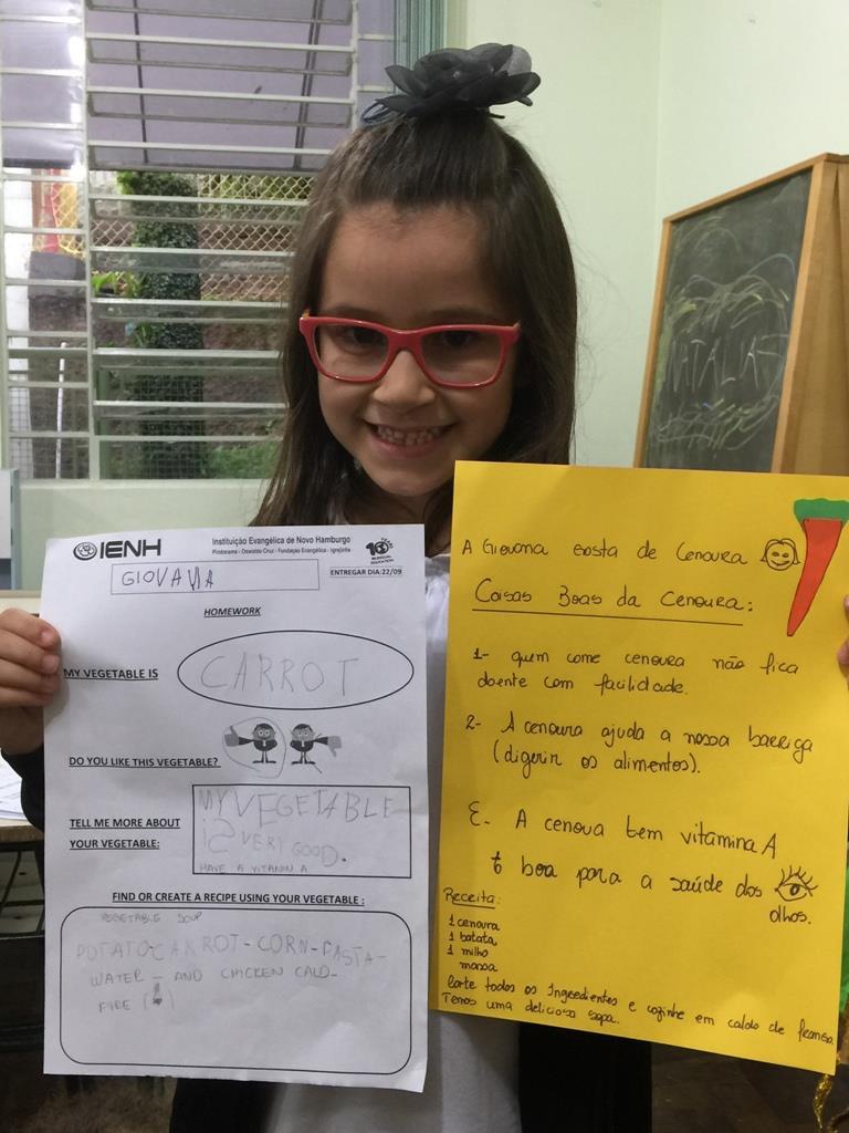 Integrando o Projeto de Estudos sobre o Corpo Humano, os alunos do Nível 5 B da Educação Infantil Bilíngue da IENH - Unidade Oswaldo Cruz foram desafiados a preparar com a família uma apresentação sobre um legume/verdura. Trabalhando a importância da alimentação saudável para o bom funcionamento do corpo, em aula, os estudantes falaram sobre características dos alimentos que apresentavam e também relataram receitas culinárias que utilizam o respectivo vegetal.
