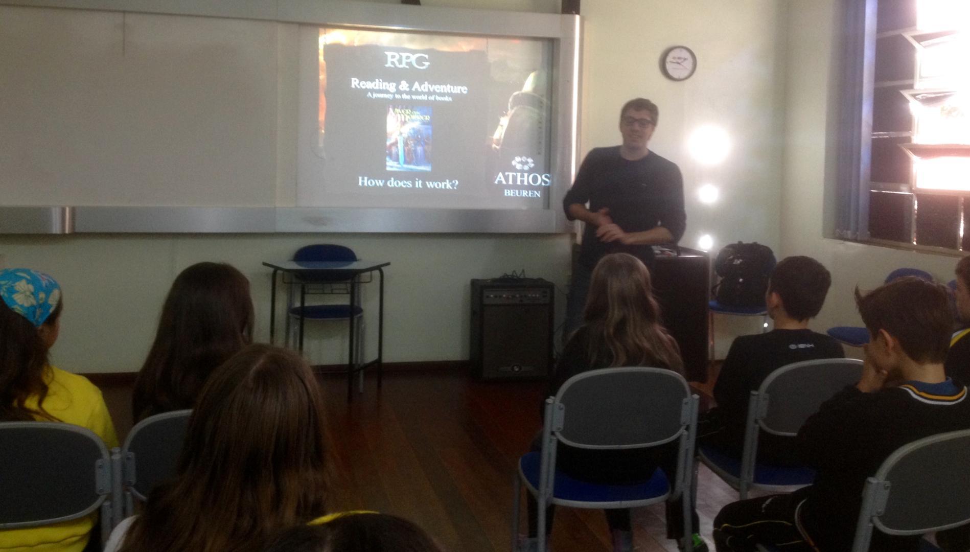 A conversa de Athos com os alunos tratou de como uma história é construída em RPG, a trama, os personagens, as estratégias do jogo. Além disso, os estudantes puderam vivenciar um jogo de RPG através de uma história narrada por Athos. Além de Janaína, a Professora Carolina Müller também acompanhou a atividade.