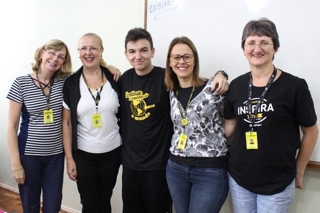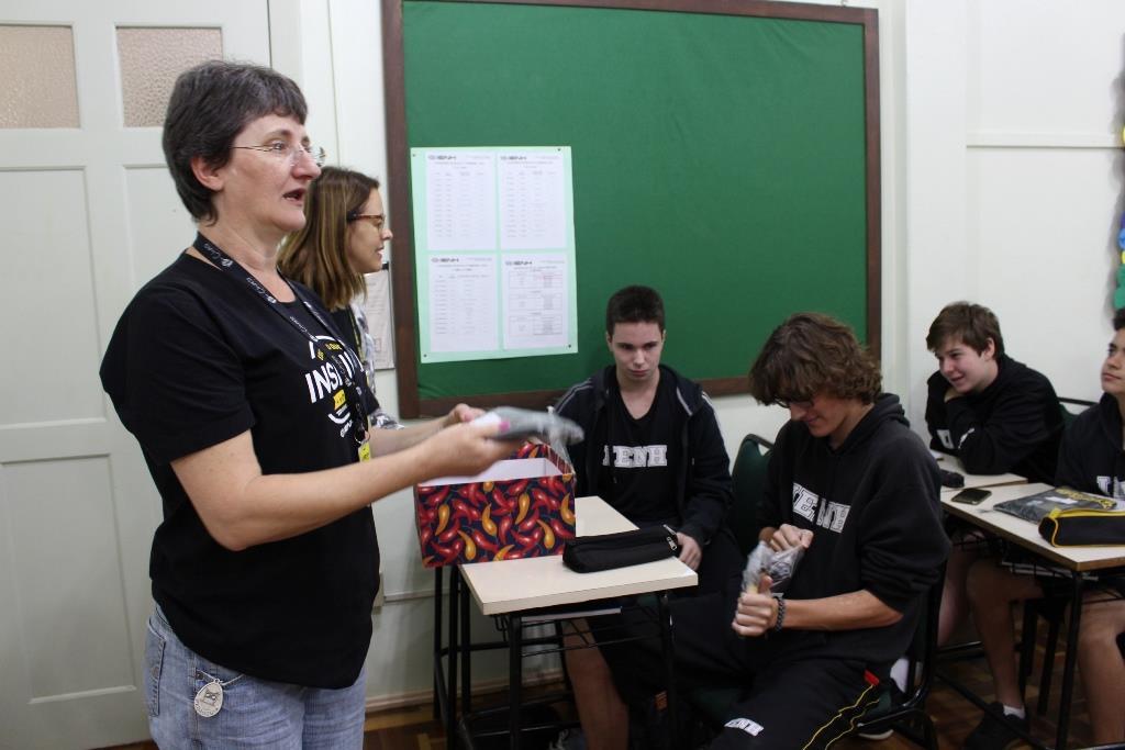 Na manhã de quarta-feira, 21 de março, camisetas com o dizer “Continue a conquistar o mundo” foram entregues aos estudantes que cursaram o 9º ano na Instituição em 2017 e seguem como alunos em 2018. O presente foi uma forma de reconhecimento e agradecimento por permanecerem na IENH. Participaram do momento a Vice-Diretora de Educação Básica da IENH e Coordenadora da Unidade Fundação Evangélica – Déborah Cassel, a Psicóloga Educacional – Patrícia Neumann e a Auxiliar de Atividades Escolares – Jacinta Frantz.