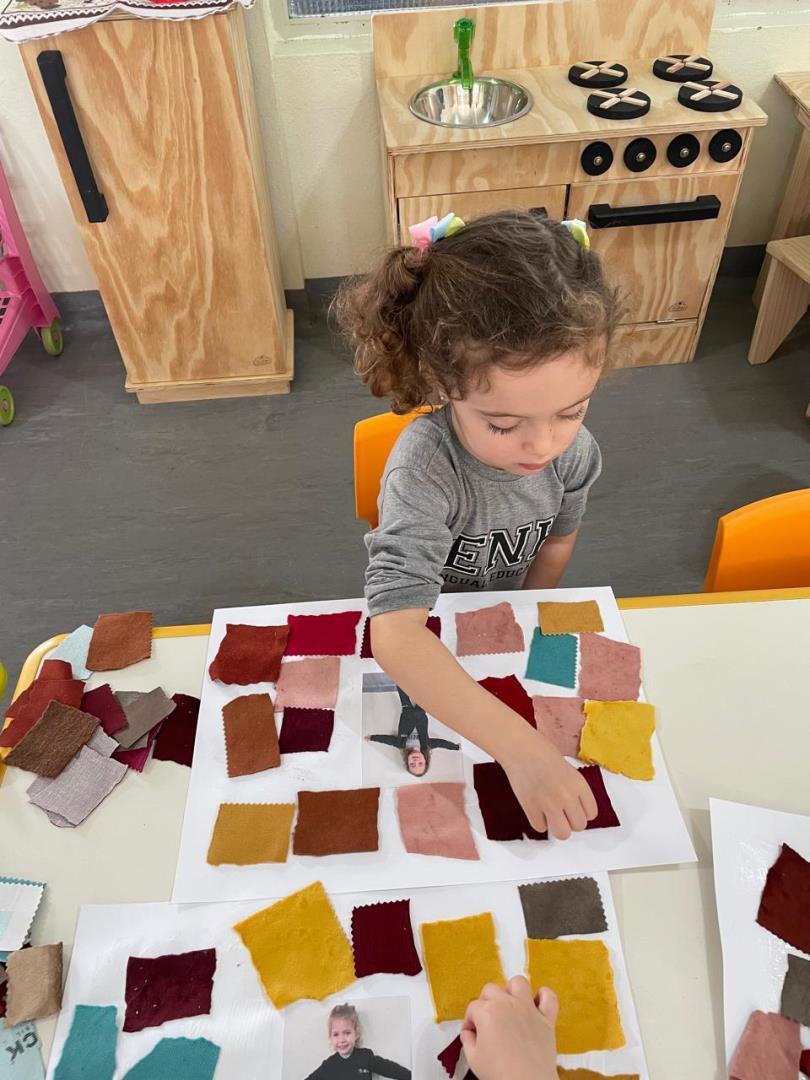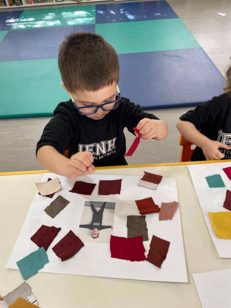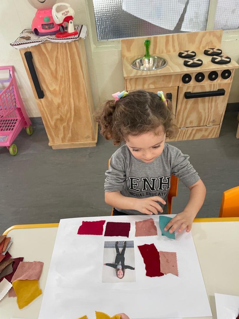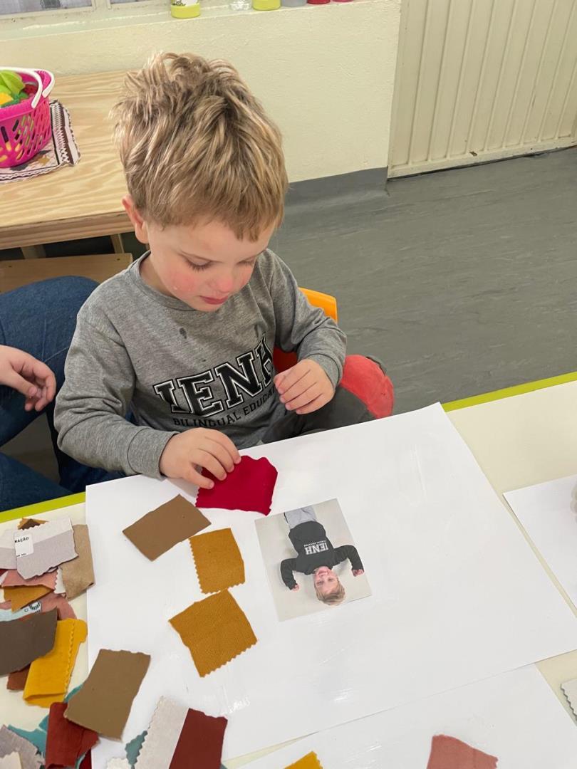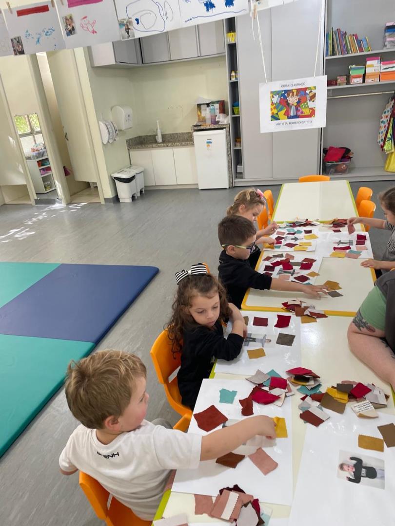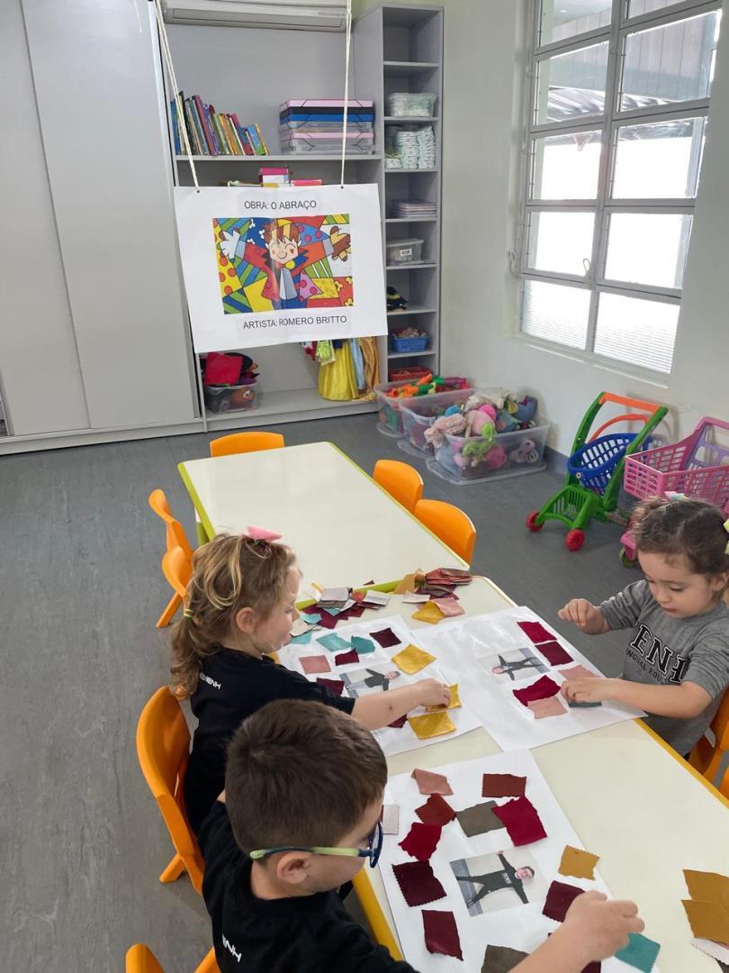 Após a conversa inicial sobre a importância dos abraços no dia a dia escolar, os alunos registraram fotograficamente a obra e, em seguida, foram convidados a produzir uma releitura criativa. Utilizando retalhos de tecido e cola, exploraram cores, formas e texturas, desenvolvendo a coordenação motora fina e expressando seus sentimentos por meio da arte.