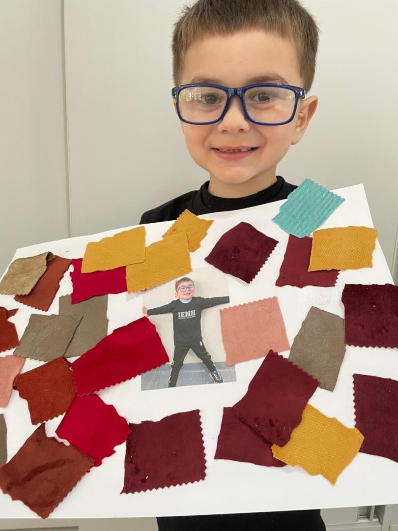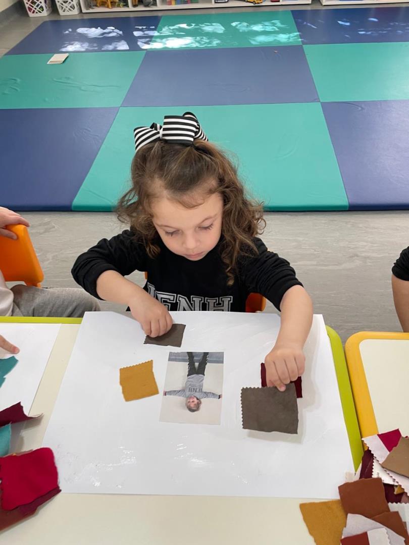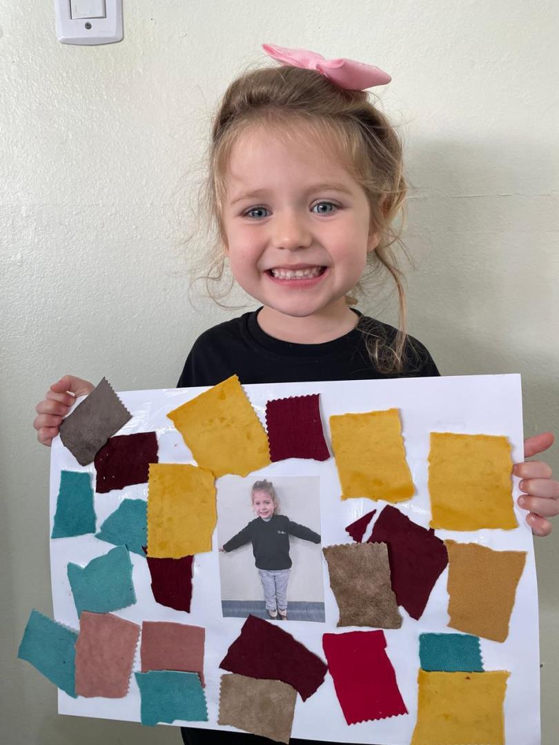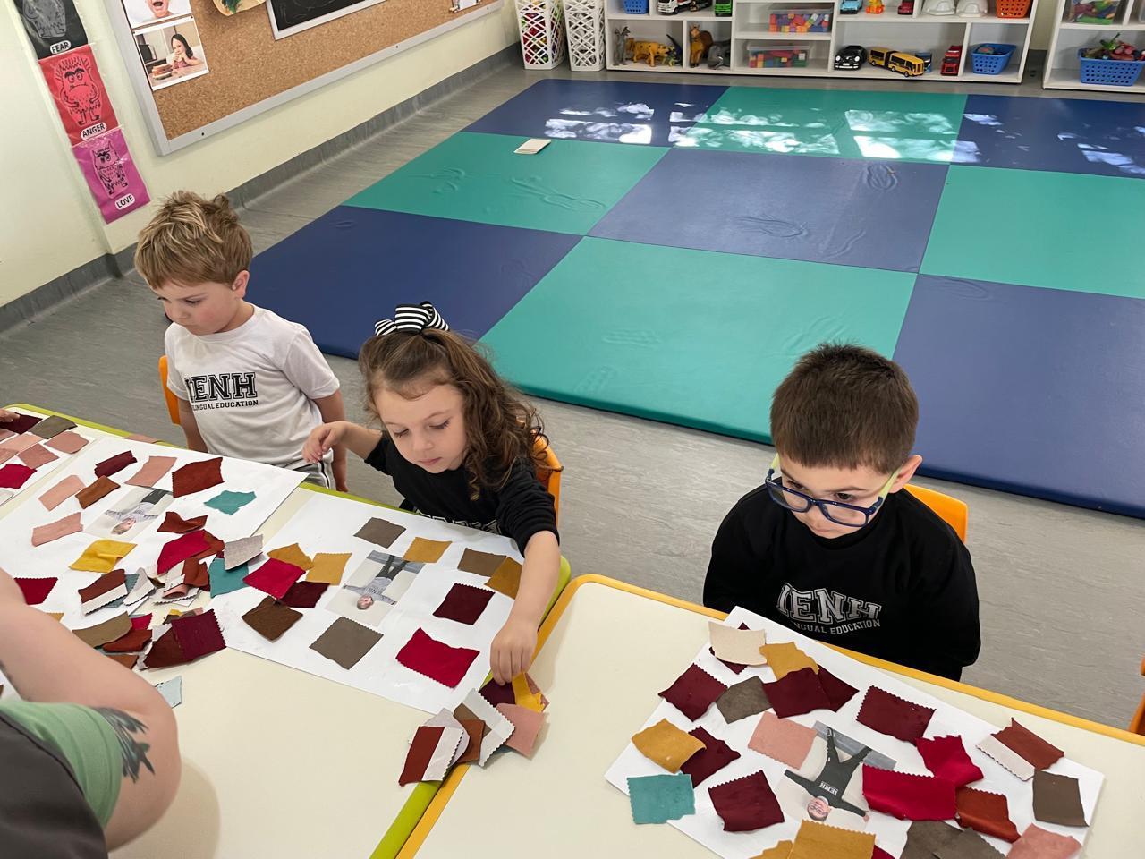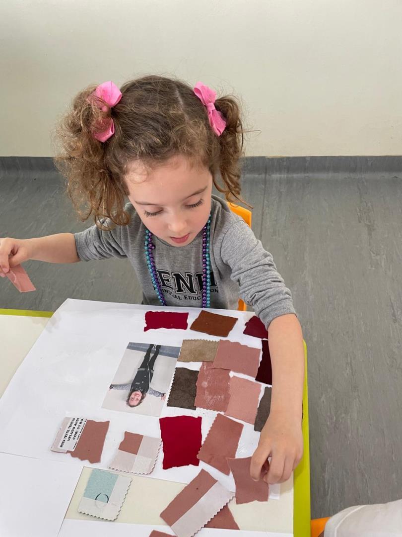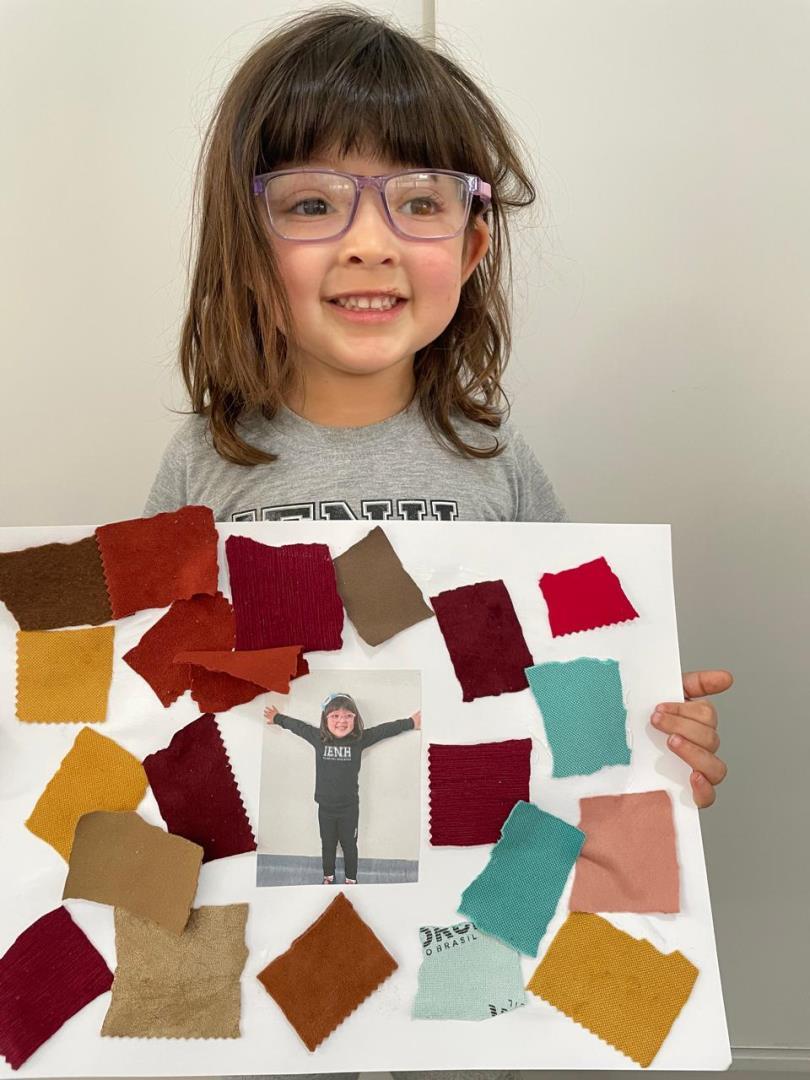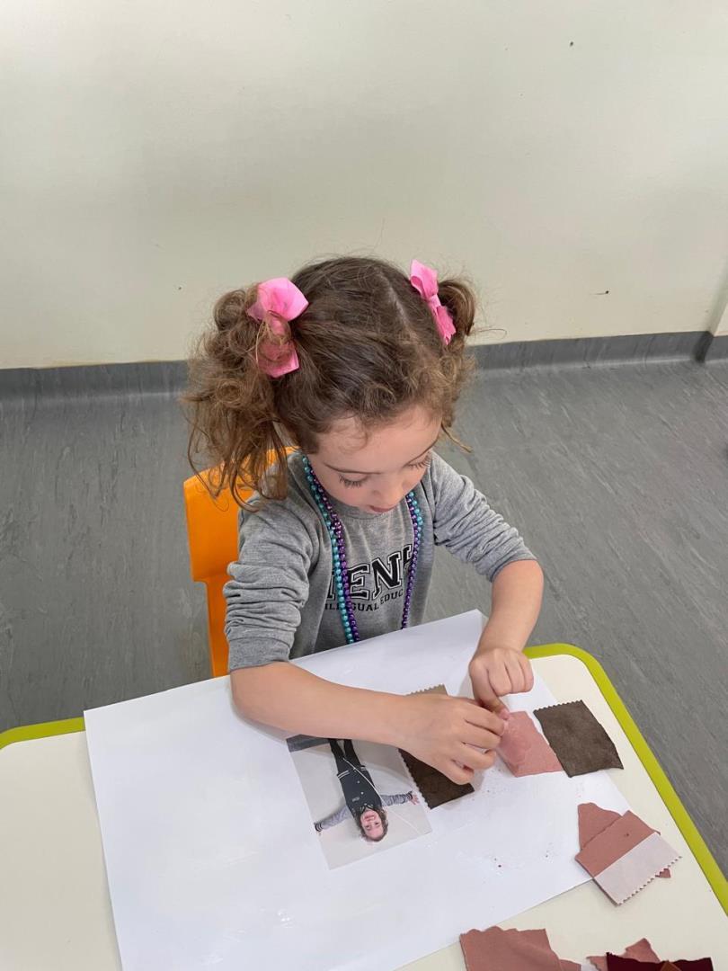 Após a conversa inicial sobre a importância dos abraços no dia a dia escolar, os alunos registraram fotograficamente a obra e, em seguida, foram convidados a produzir uma releitura criativa. Utilizando retalhos de tecido e cola, exploraram cores, formas e texturas, desenvolvendo a coordenação motora fina e expressando seus sentimentos por meio da arte.
