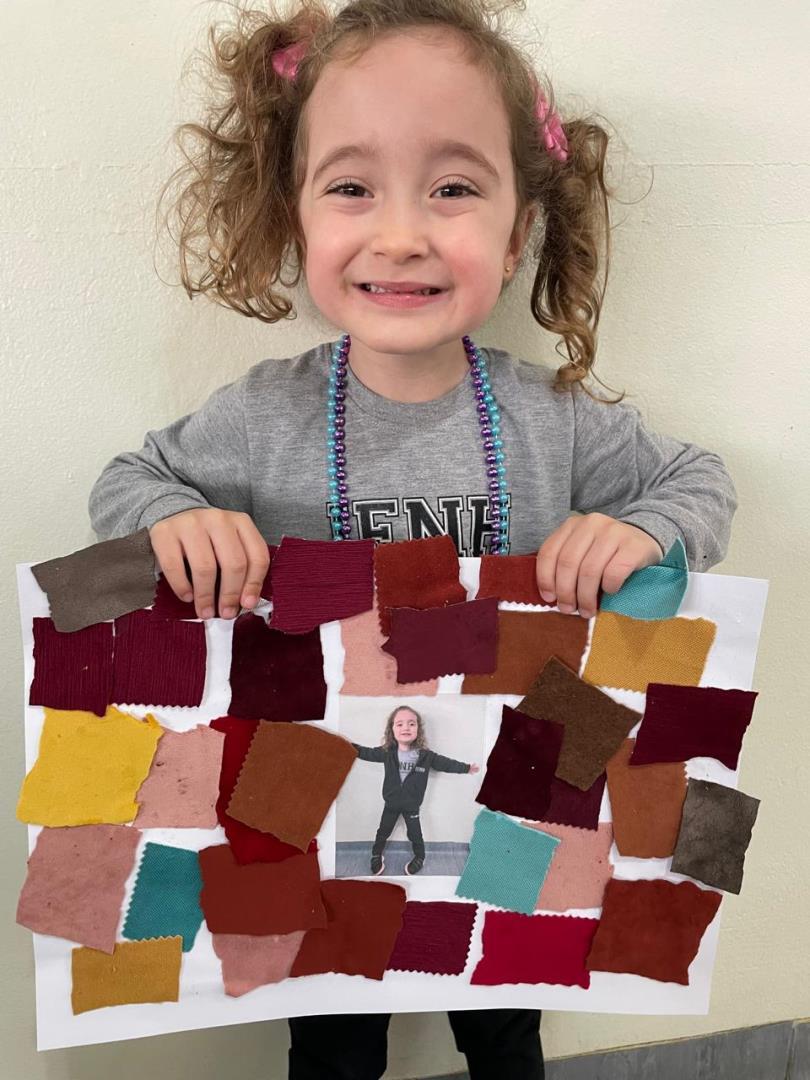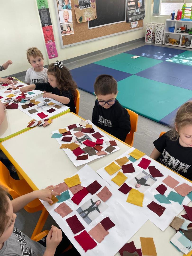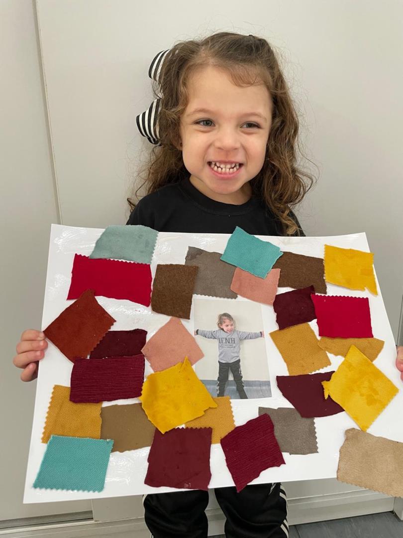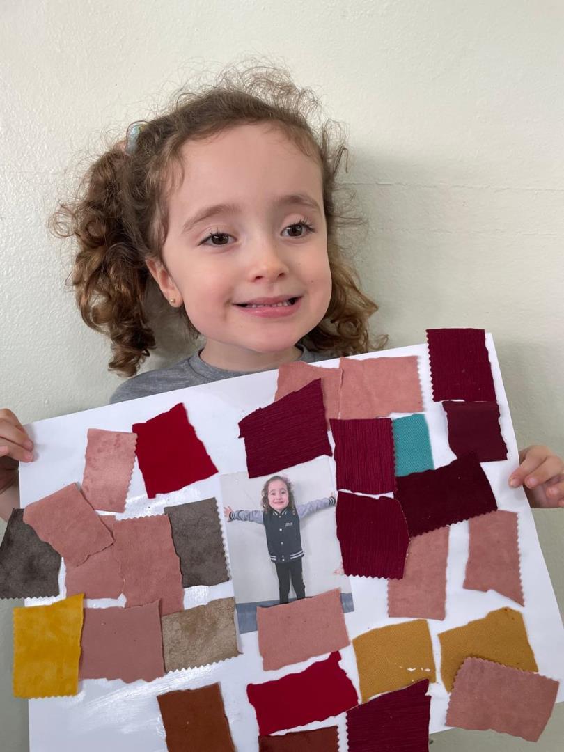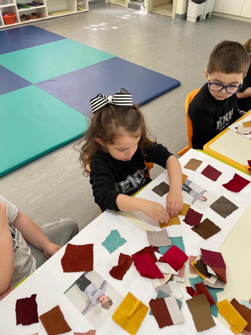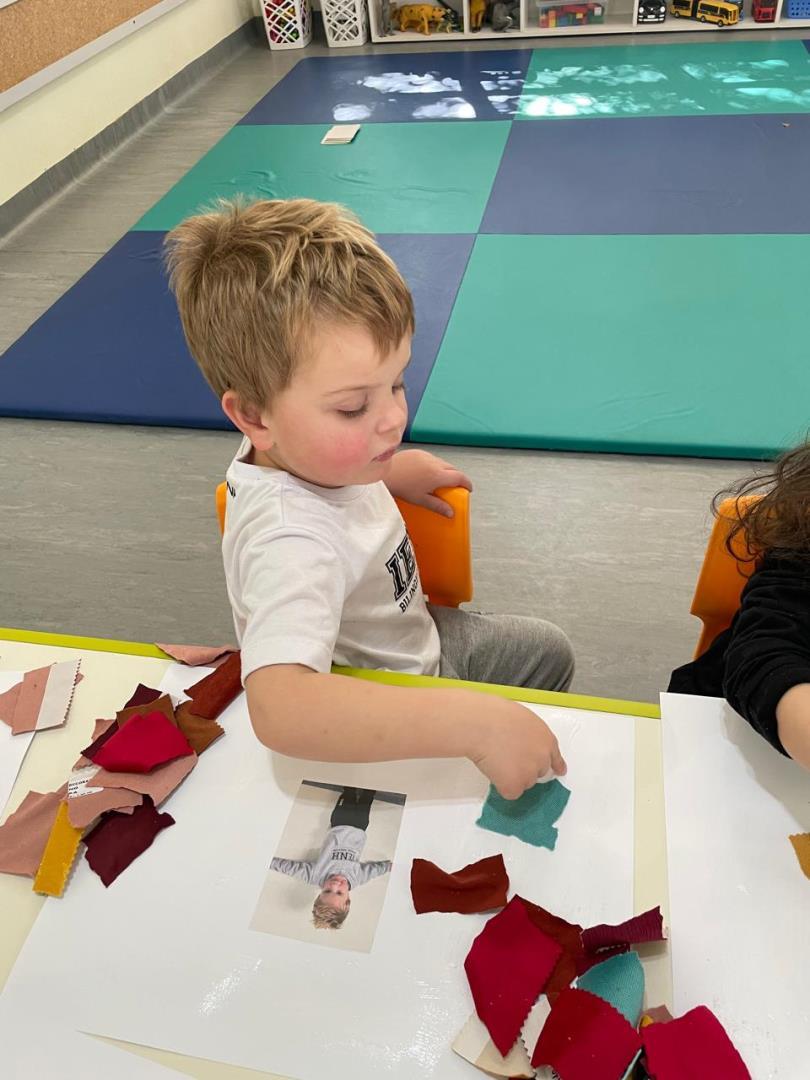 Após a conversa inicial sobre a importância dos abraços no dia a dia escolar, os alunos registraram fotograficamente a obra e, em seguida, foram convidados a produzir uma releitura criativa. Utilizando retalhos de tecido e cola, exploraram cores, formas e texturas, desenvolvendo a coordenação motora fina e expressando seus sentimentos por meio da arte.