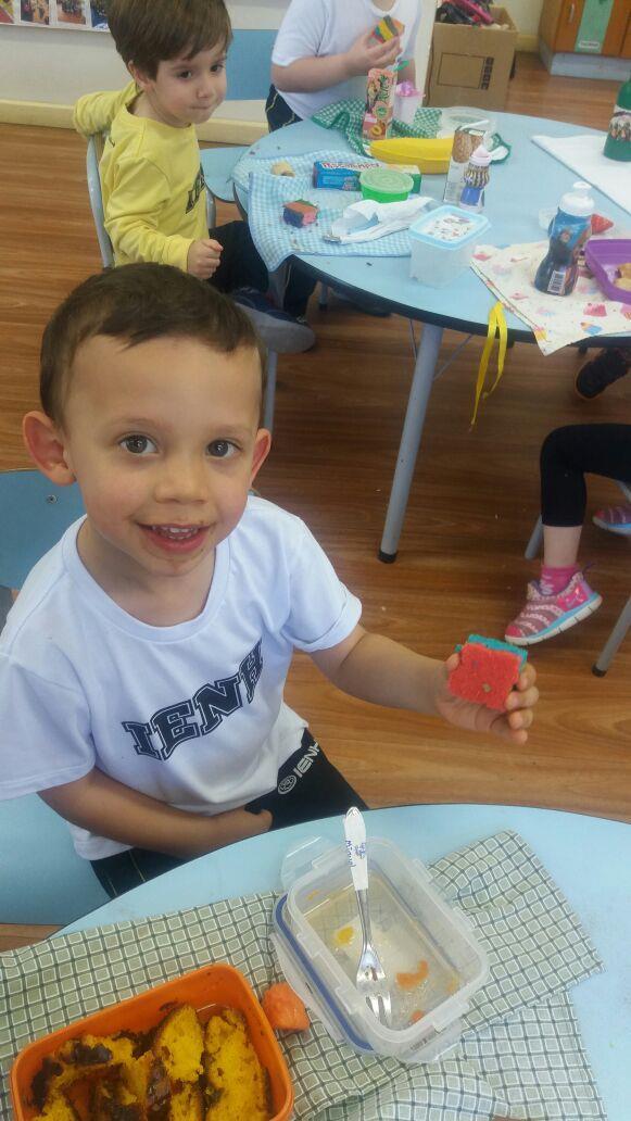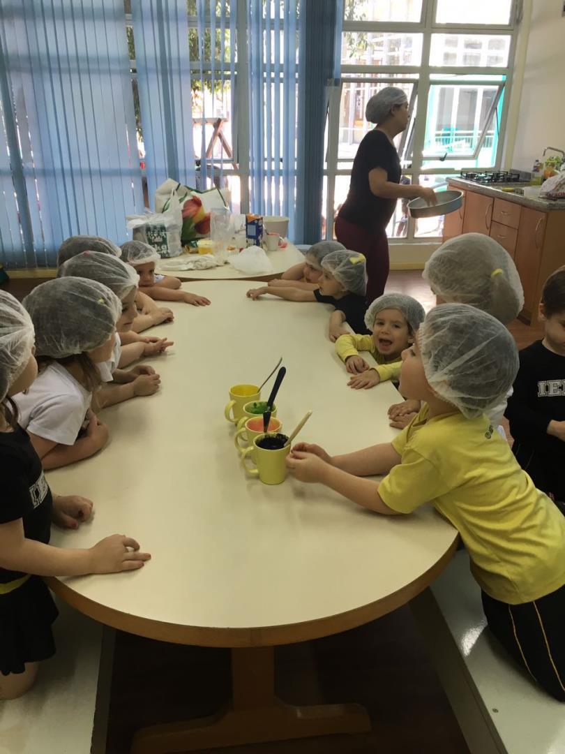 Cada aluno mexeu a massa do bolo e encontrava uma cor. Conforme mexiam, eram encorajados a dizer as cores que encontravam. Para formar o bolo, a Professora Kelly Melo solicitava o nome da cor em Inglês e era correspondida pelos alunos que expressavam palavras como green, pink e red. “A atividade contribuiu para consolidar o vocabulário estudado em aula sobre as cores. Os alunos adoram fazer aula de culinária, foi um momento muito divertido e gostoso”, comenta Kelly.