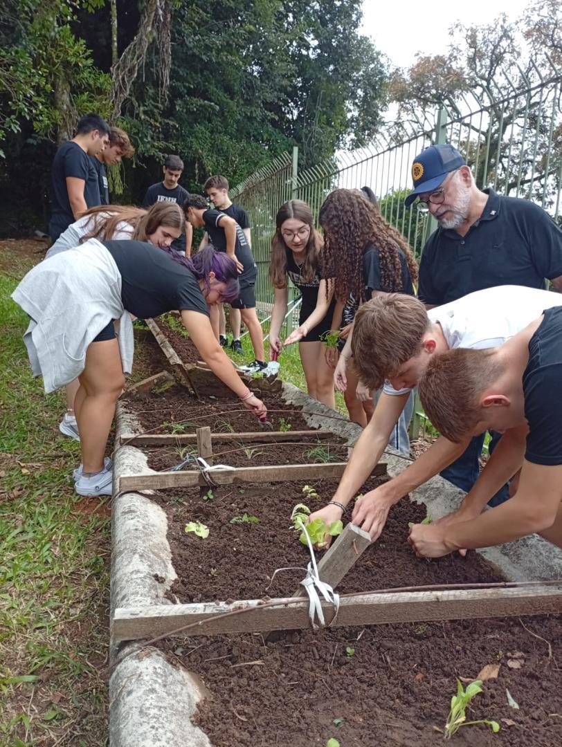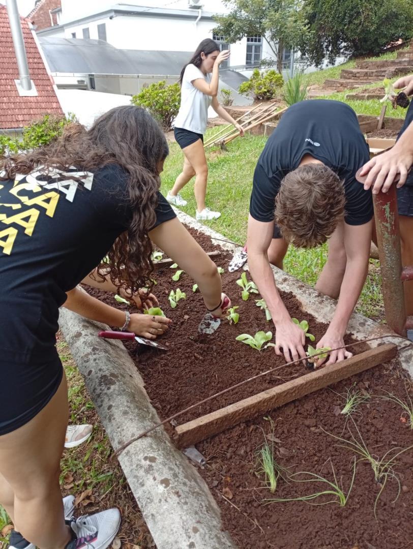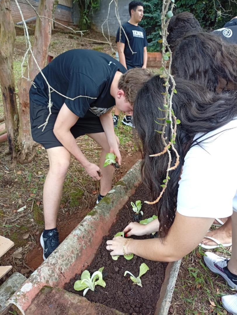 Na sequência, os estudantes participaram de uma atividade prática na horta da escola. Durante a vivência, colocaram a mão na terra, preparando o solo, organizando os canteiros e realizando o plantio de mudas de hortaliças. O contato direto com os ciclos naturais ampliou a percepção sobre a importância do cuidado com o solo, a água e os seres vivos envolvidos nesse processo.