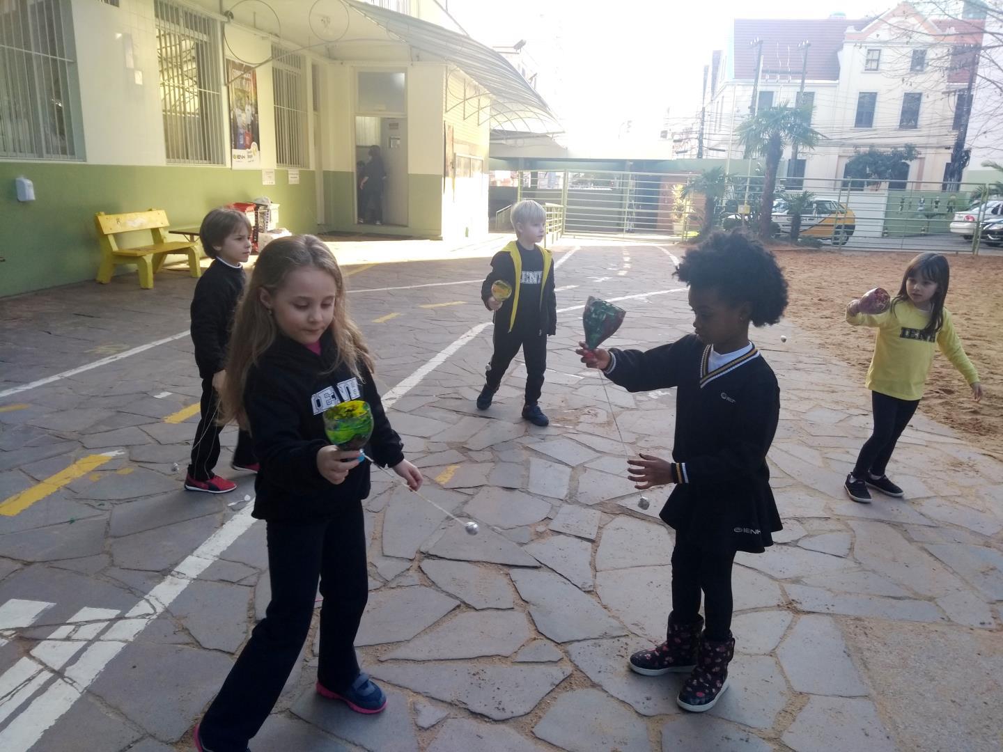 Na aula de Educação Física, com o Professor Gustavo Paraboni, realizaram a criação e exploração de um bilboquê. E, na aula de Educação Tecnológica, com a Professora Jaqueline Grassmann, em duplas, fizeram registros de doces e a gravação em QR CODE da parlenda “Batata doce”.