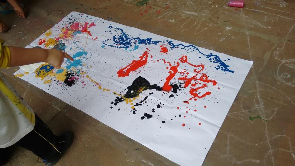 Nas atividades com o tema “Brincando, criando e construindo”, o grupo trabalhou com a técnica de carimbos utilizando objetos, a partir das obras do artista plástico Jackson Pollock. Os alunos pintaram com barbante suas telas e realizaram um trabalho coletivo pintando com as bisnagas. “As artes plásticas estimulam as crianças a se expressarem de forma criativa”, relata a Professora Lilian Terezinha de Souza.
