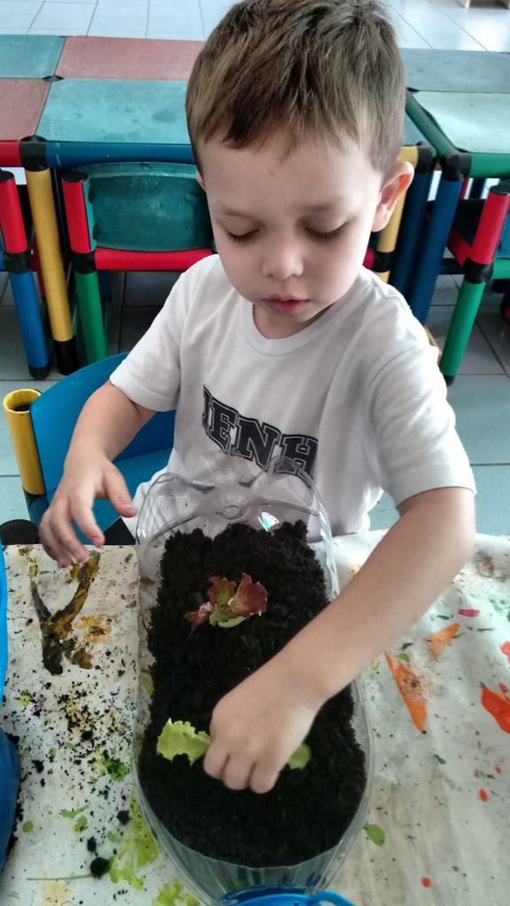 Nas vivências do cotidiano, os estudantes plantaram mudas de alface crespa e alface roxa. Cada aluno levará duas mudas para casa no final do mês de novembro e, juntamente com a família, cuidarão das plantas e colherão para preparar uma deliciosa salada. “Como foram eles que plantaram, esperamos que seja mais fácil para experimentarem e terem uma alimentação saudável. Nosso mês foi de aprendizagens muito significativas e importantes para o desenvolvimento de cada um dos nossos alunos”, destaca a Professora Lilian.