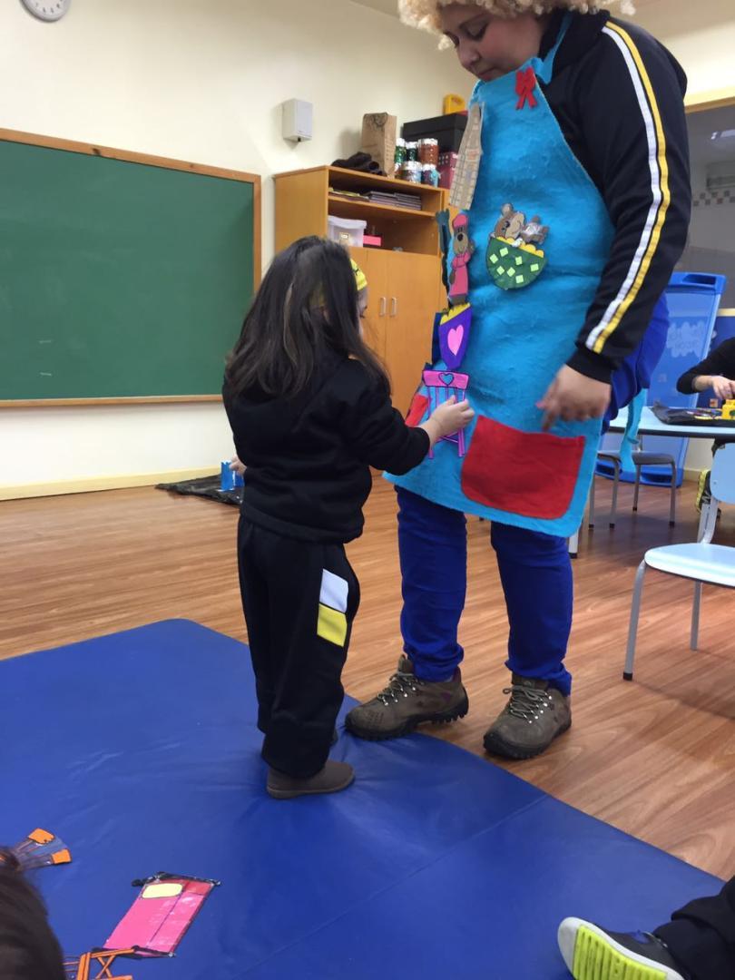 A Cachinhos Dourados queria contar a história dela para as turmas, porém ela só falava Inglês e os alunos precisavam ajudá-la a montar o conto no seu vestido. Conforme ela falava, os alunos auxiliavam na montagem. Através da história e da conversa com a personagem, os estudantes trabalharam o vocabulário sobre os membros da família (daddy, mommy e baby) e também tamanhos (big, medium e small).