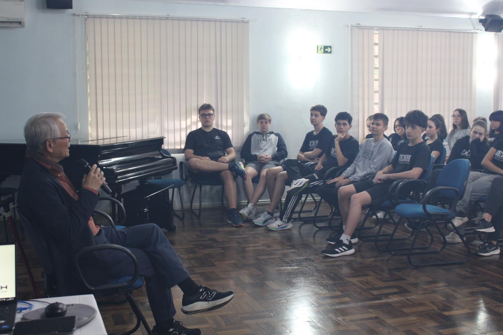 Durante o encontro, os estudantes também puderam conhecer a trajetória do ex-aluno da IENH Bernardo Leist Mosmann, que participou do intercâmbio da instituição no Canadá e, posteriormente, decidiu seguir seus estudos no país. Hoje, Bernardo se destaca por seu desempenho acadêmico, tendo conquistado bolsas de estudo e reconhecimento em sua trajetória educacional.