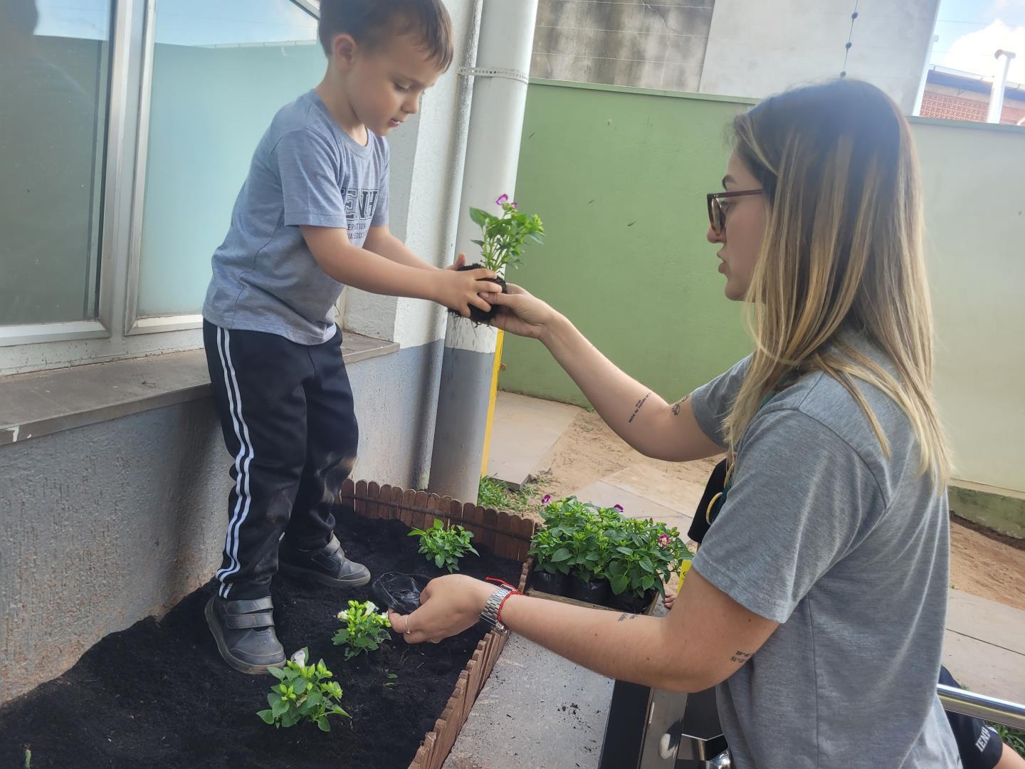Após as observações, os pequenos decidiram plantar flores e ervas no pátio da Educação Infantil, tornando o ambiente mais colorido e agradável. O momento foi registrado em fotos e vídeos, com relatos espontâneos das crianças sobre suas descobertas e percepções.