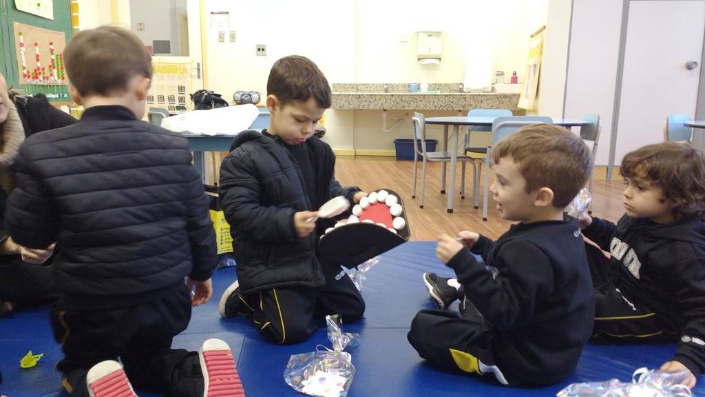 A atividade ocorreu no dia 21 de agosto e foi planejada pensando em contextualizar o assunto sobre o nascimento dos dentes com o projeto de estudos “O nascer das coisas”, desenvolvido pela turma. A Dentista Melissa explicou e mostrou de forma lúdica como acontece o processo de nascimento dos dentes e, posteriormente, também explicou que os mesmos caem para então nascer os dentes permanentes. Quebra-cabeça, urso de pelúcia e materiais ilustrativos foram utilizados por Melissa nos momentos de explicação.