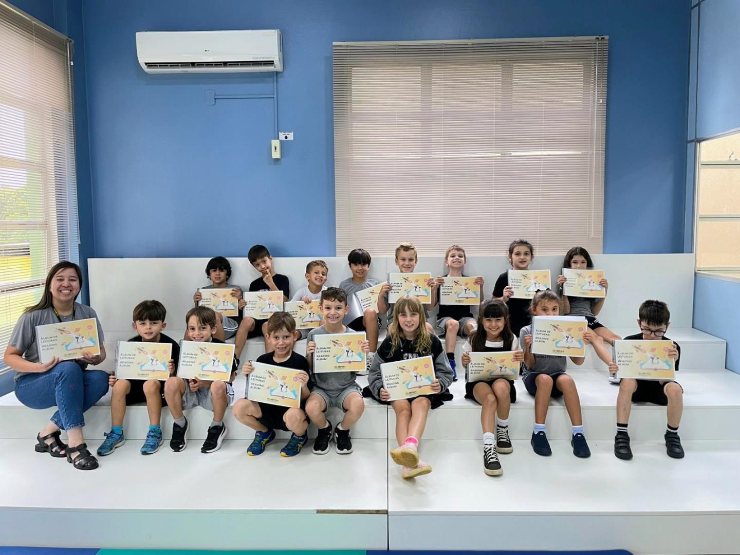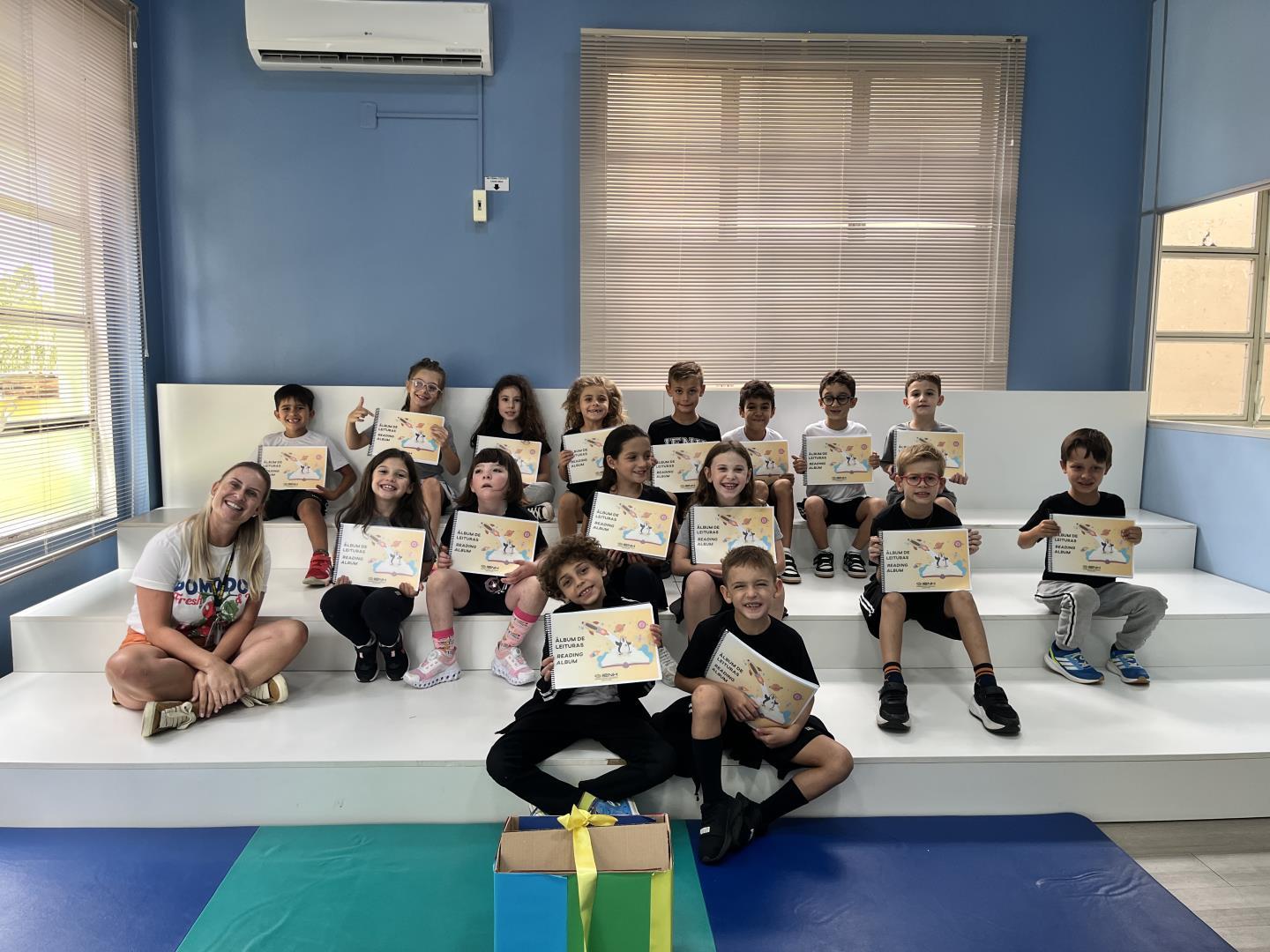 Na sequência, após compartilharem suas percepções sobre a experiência, os estudantes foram apresentados a uma nova caixa, desta vez colorida. Novamente, a curiosidade tomou conta do grupo, que levantou diferentes hipóteses sobre o que poderia estar em seu interior. Foi então que cada aluno recebeu o seu Álbum de Leituras/Reading Album.