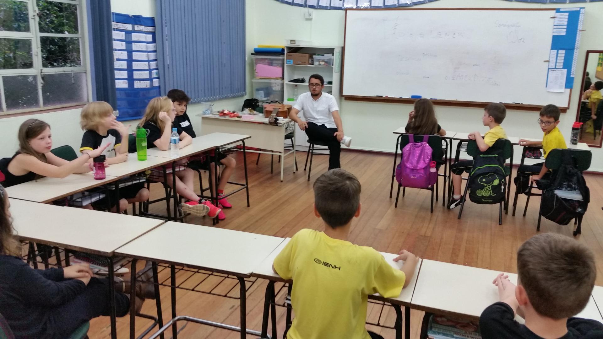 Para finalizar, acompanhados pelo visitante que tocou violão, os alunos cantaram a canção “A amizade é tudo”. “Lucas Reis, atualmente, trabalha na empresa Crespi do Brasil e à noite cursa o 5°semestre de Design na Universidade Feevale”, relata a Professora Ana.