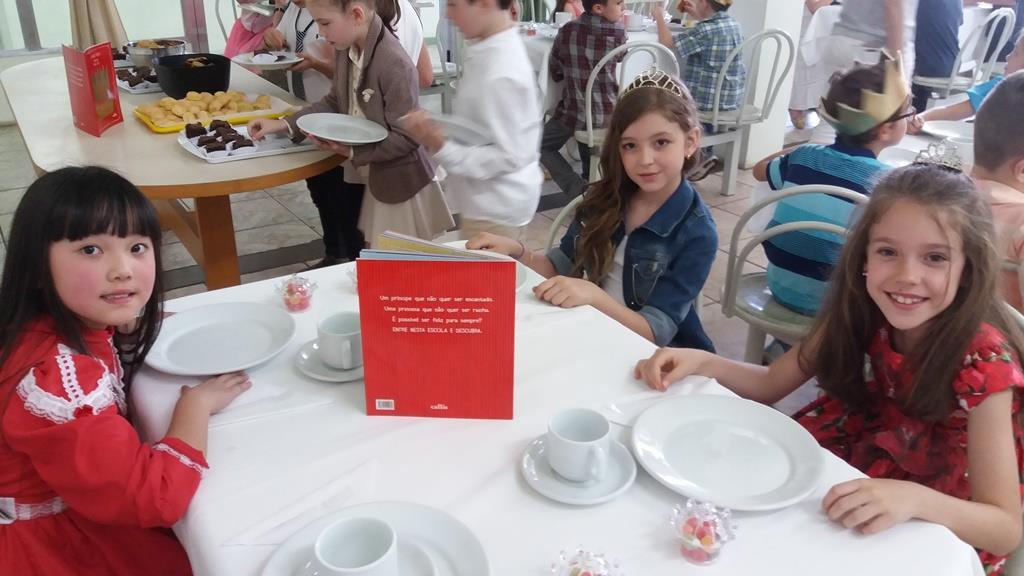 O lanche da tarde foi um delicioso chá real. Os chás foram colhidos pelos alunos diretamente da horta escolar. Também degustaram cookies que fizeram no dia anterior, bolo e pão de queijo.