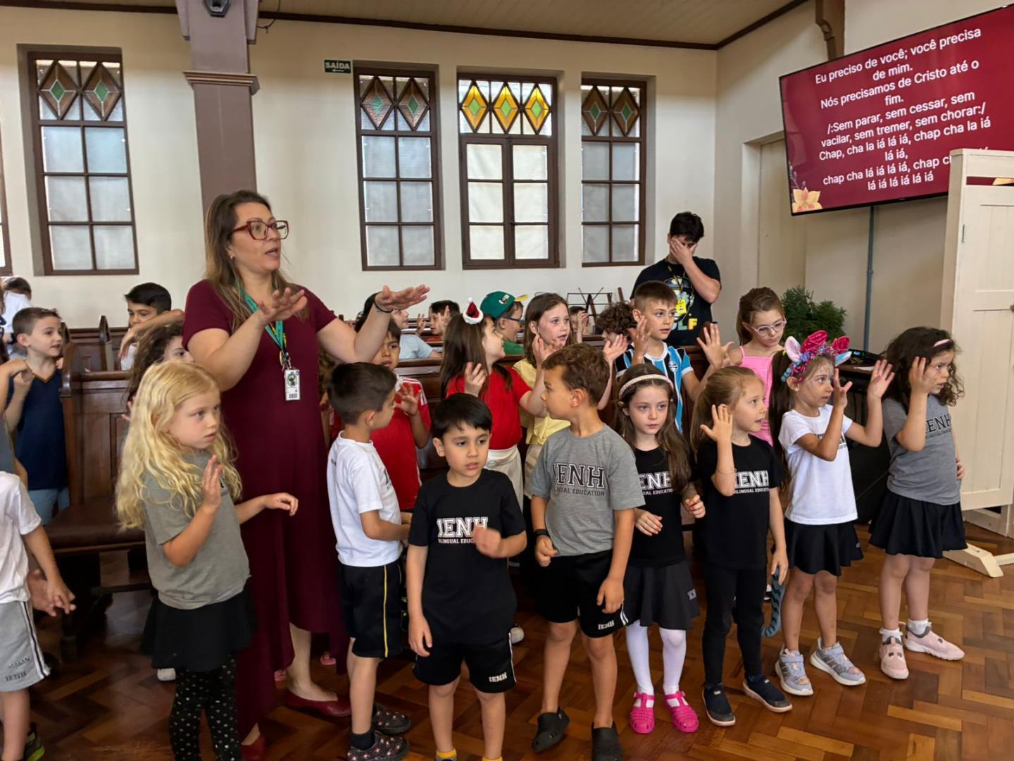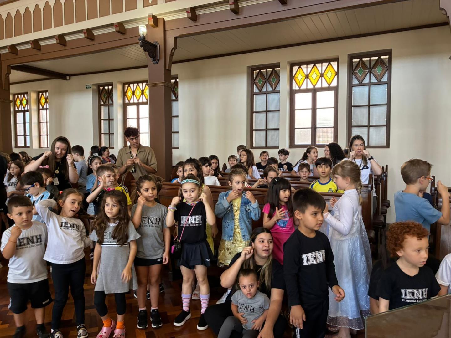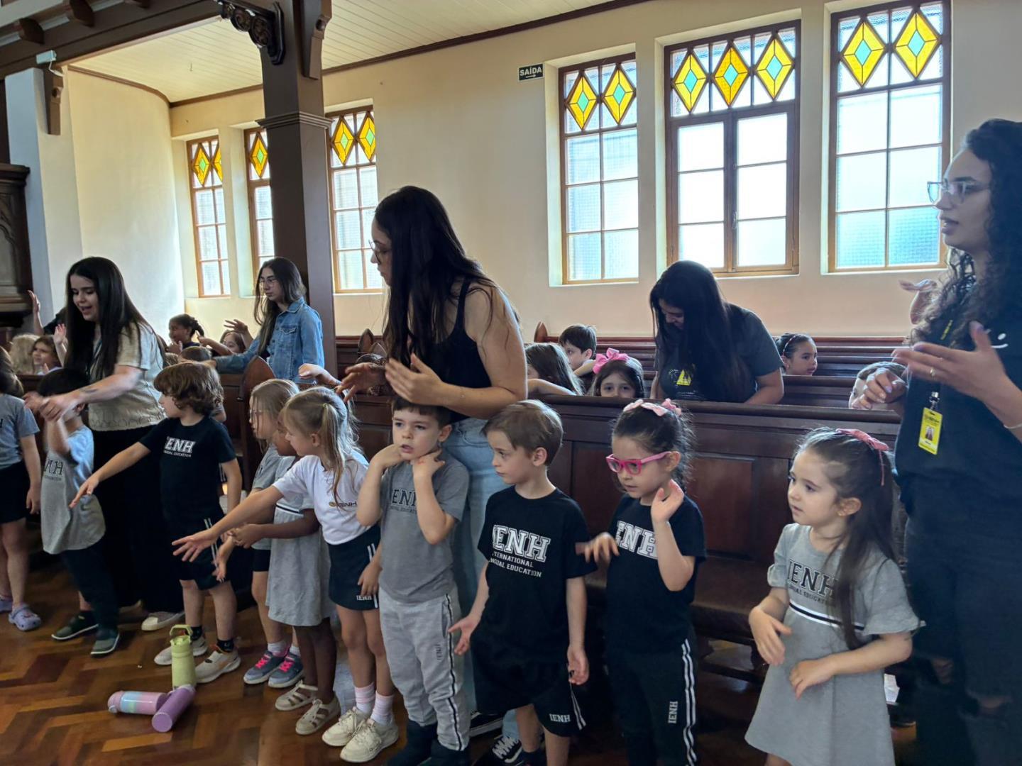 Na tarde da quinta-feira, 11 de dezembro, estudantes do Kindergarten 4 ao Year 4 da Educação Infantil e Ensino Fundamental do Currículo Internacional Bilíngue da IENH – Unidade Pindorama participaram de um momento especial de Advento e Natal na Igreja Três Reis Magos. A atividade iniciou com uma acolhida conduzida pela coordenadora de Unidade, Karina Spessato, que recebeu as turmas e marcou simbolicamente o começo do encontro com o toque do sino da igreja.