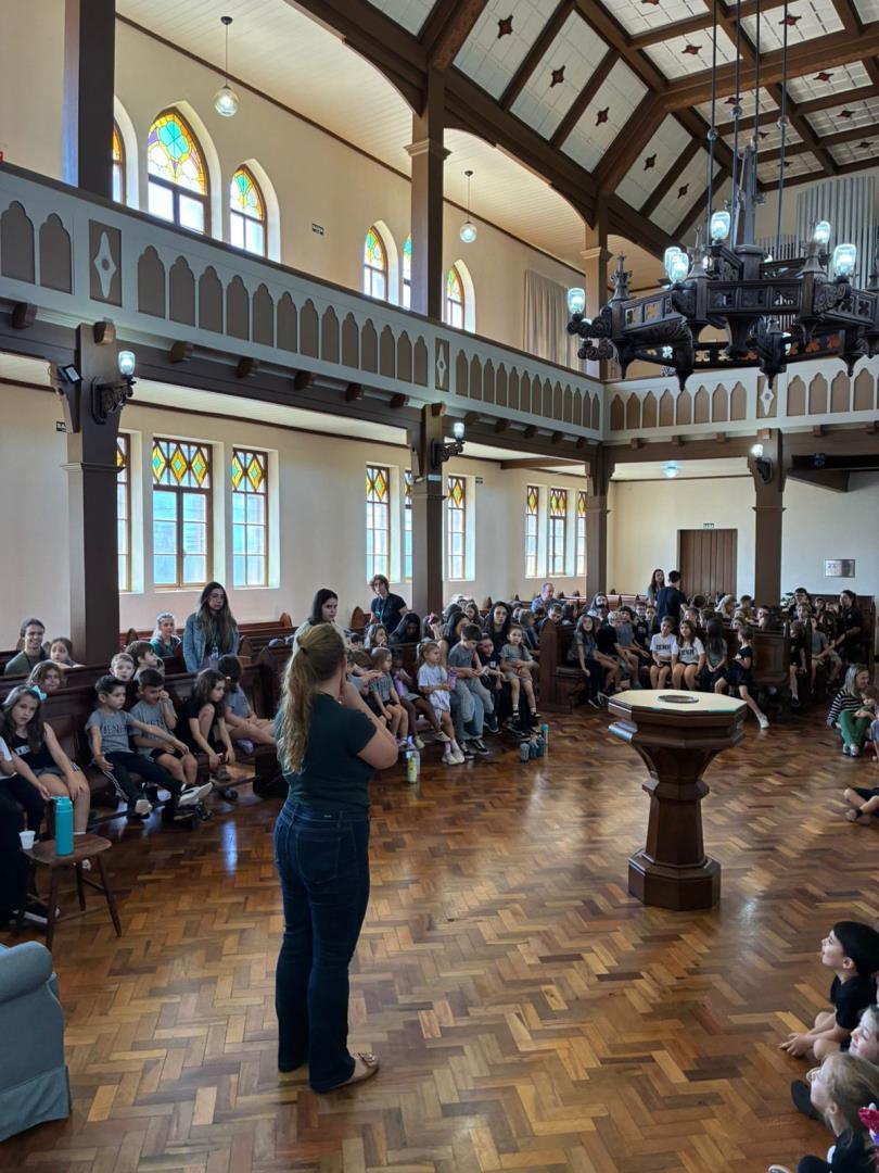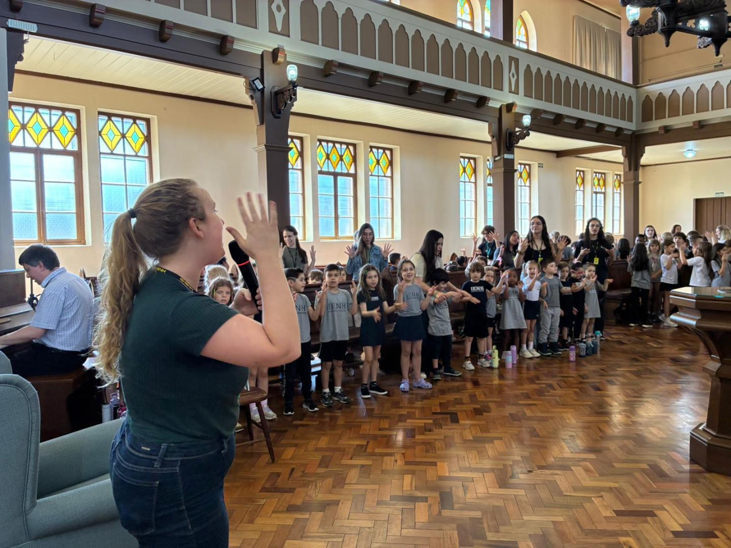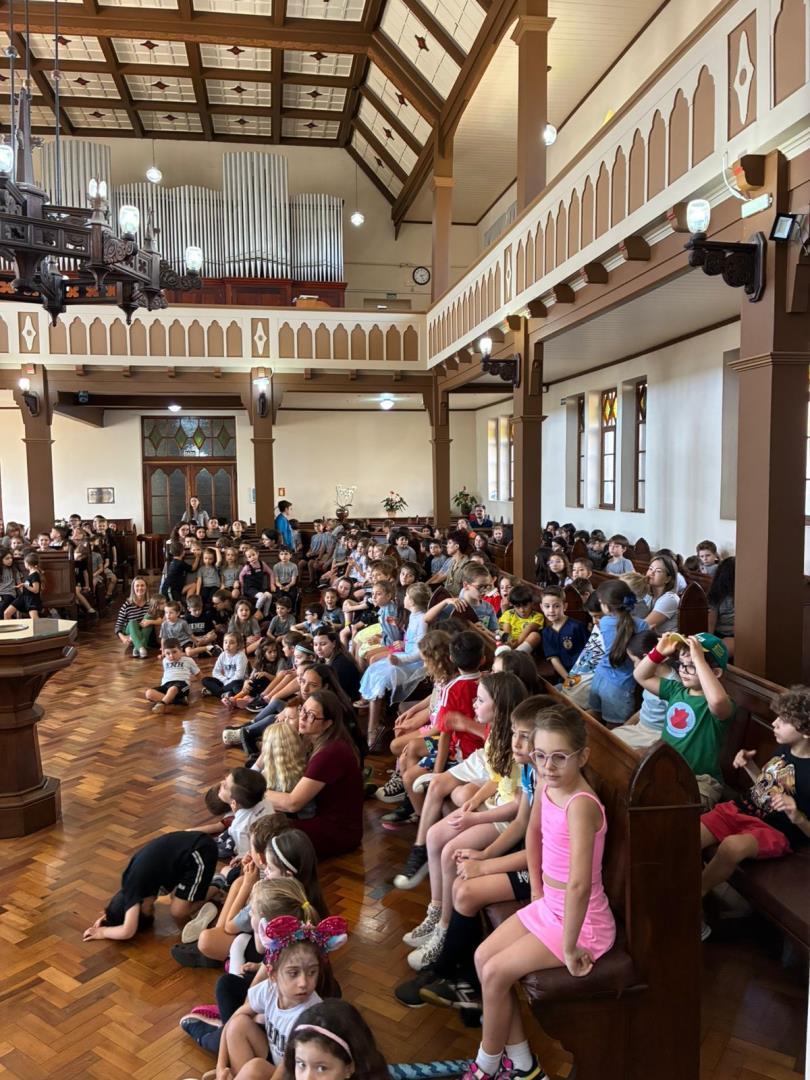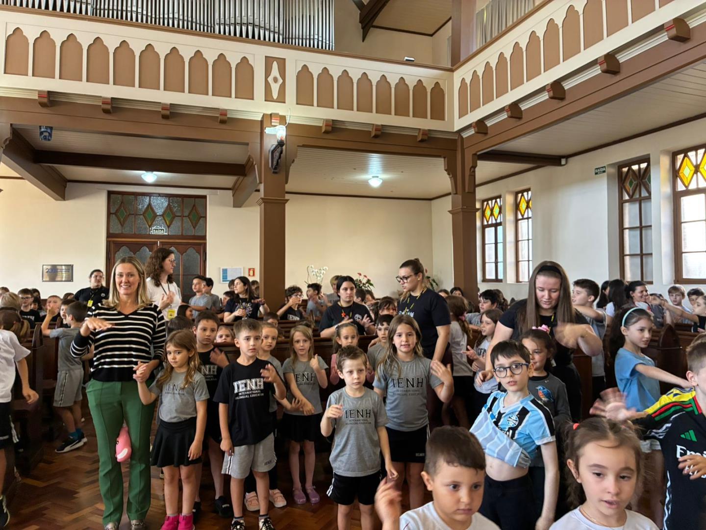 Na tarde da quinta-feira, 11 de dezembro, estudantes do Kindergarten 4 ao Year 4 da Educação Infantil e Ensino Fundamental do Currículo Internacional Bilíngue da IENH – Unidade Pindorama participaram de um momento especial de Advento e Natal na Igreja Três Reis Magos. A atividade iniciou com uma acolhida conduzida pela coordenadora de Unidade, Karina Spessato, que recebeu as turmas e marcou simbolicamente o começo do encontro com o toque do sino da igreja.