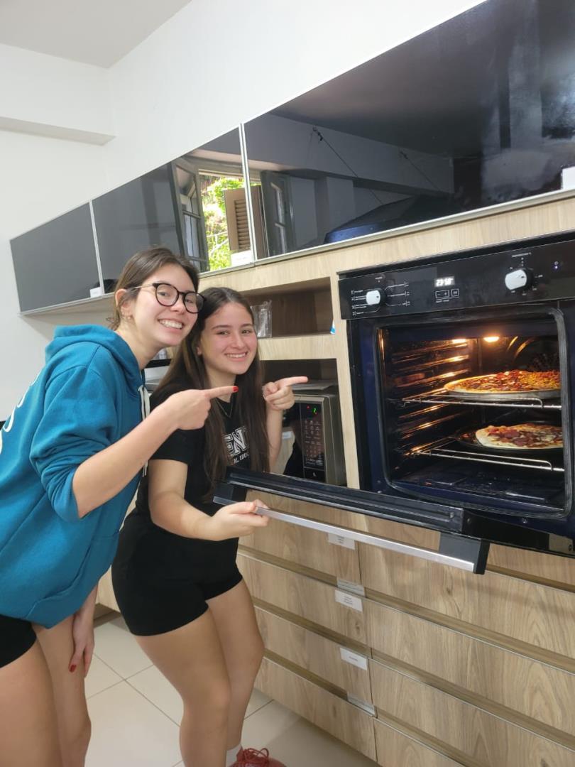 Após o preparo das pizzas, os estudantes encerraram a atividade com um momento de confraternização, saboreando juntos o resultado do trabalho em equipe e celebrando a experiência de aprendizado vivenciada na cozinha.