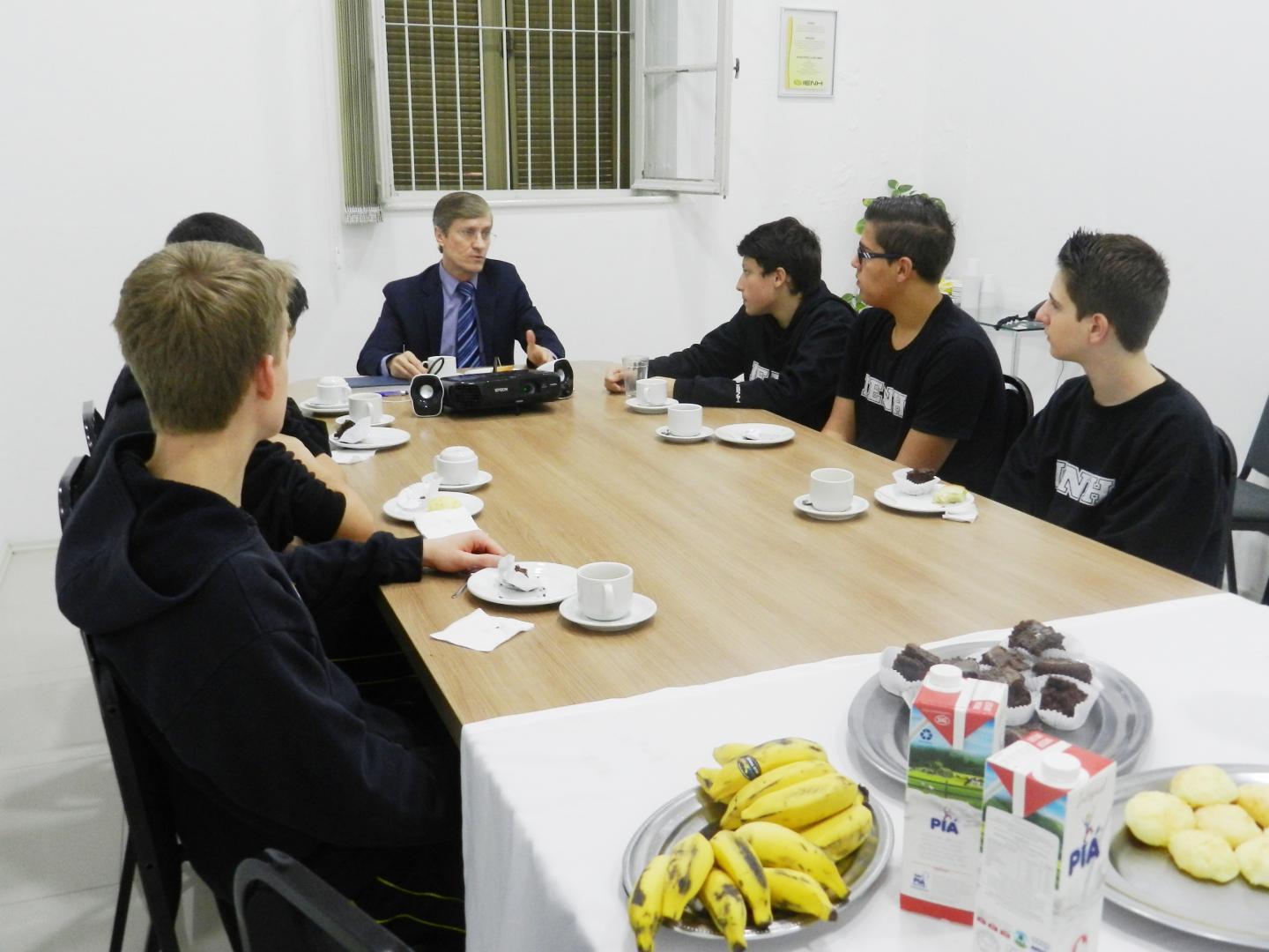 Na manhã do dia 06, os estudantes reuniram-se em um Café da Manhã com o Diretor Geral da IENH – Seno Leonhardt. No momento, Leonhardt compartilhou vivências da sua trajetória acadêmica e profissional com os alunos.