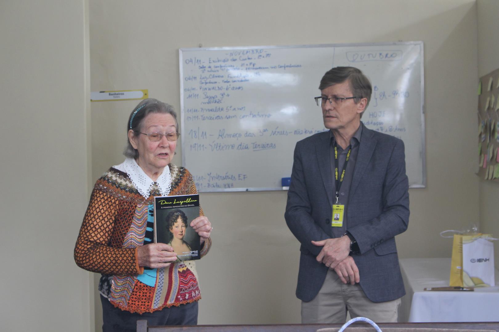 No dia 31 de outubro, a ex-professora da IENH - Unidade Fundação Evangélica, Liti Belinha Rheinheimer, retornou à escola para uma visita repleta de lembranças e significado. Recebida pelo diretor geral Seno Leonhardt e pelos professores, ela pôde rever o ambiente escolar e entregar doações de livros para o acervo da biblioteca.