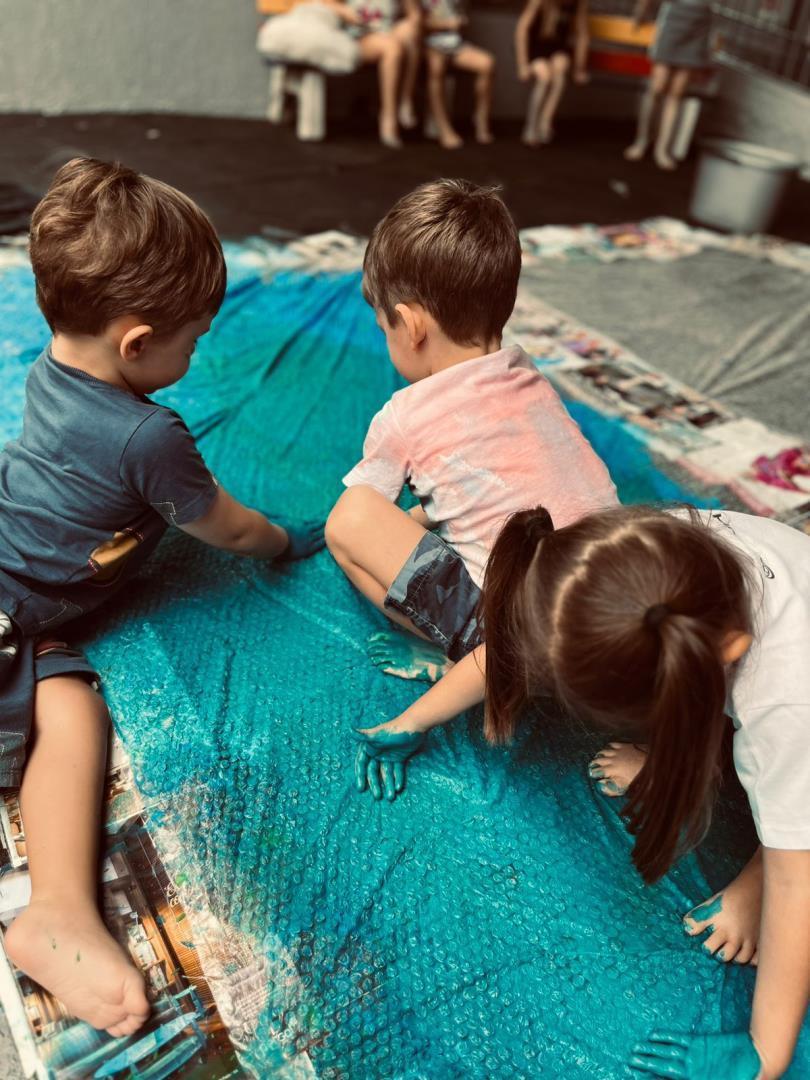 Para iniciar o momento, a teacher Daniela Brecher convidou o grupo a imaginar o oceano, ouvindo o som das ondas e conversando sobre suas cores e os animais marinhos. A atmosfera de encantamento aumentou quando as crianças encontraram um grande plástico bolha estendido pelo chão, que serviria de base para a construção de um mar coletivo.
