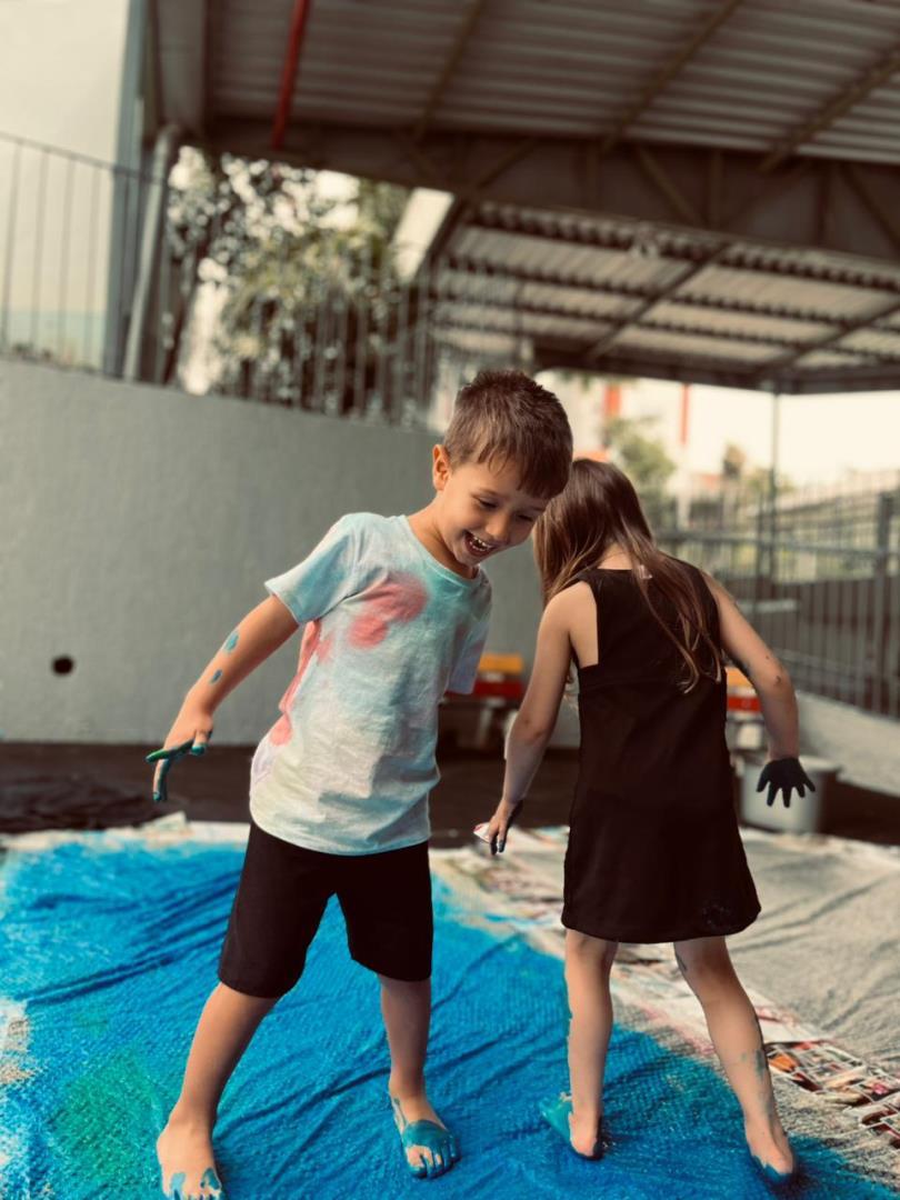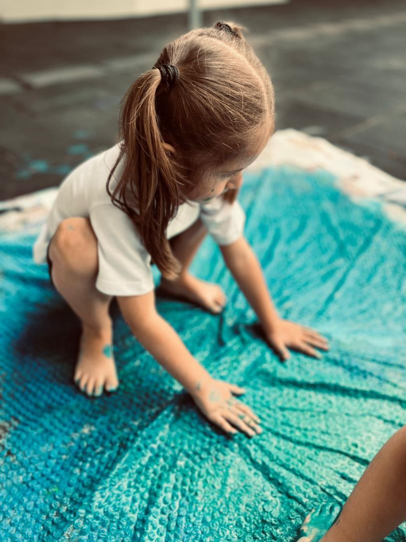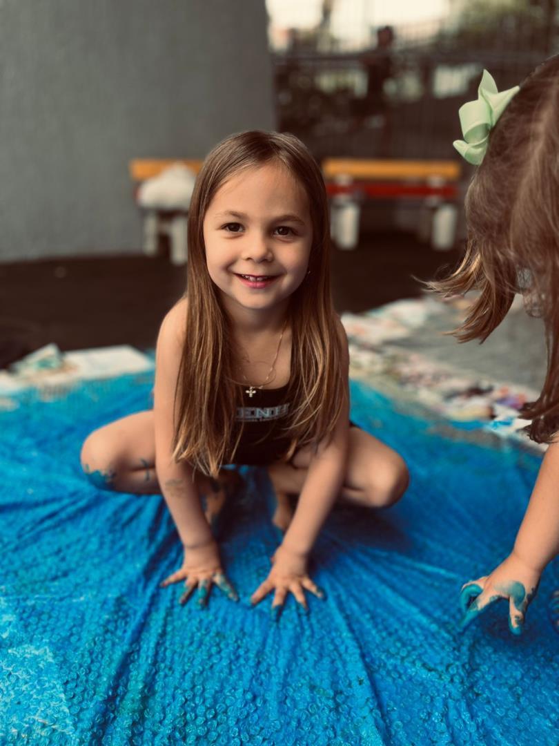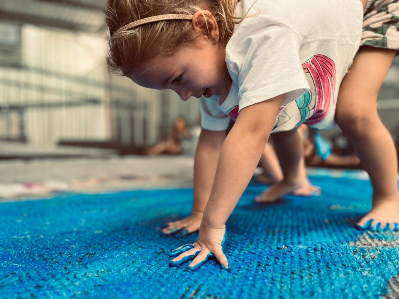 Usando tinta azul lavável e contando com as próprias mãos e pés como ferramentas, os estudantes exploraram livremente a textura do plástico bolha, o estalar das bolhas e a sensação da tinta. O espaço se transformou em um ambiente de alegria, movimento e curiosidade, sempre acompanhado pela teacher, que incentivou a linguagem, a exploração e a expressão corporal.