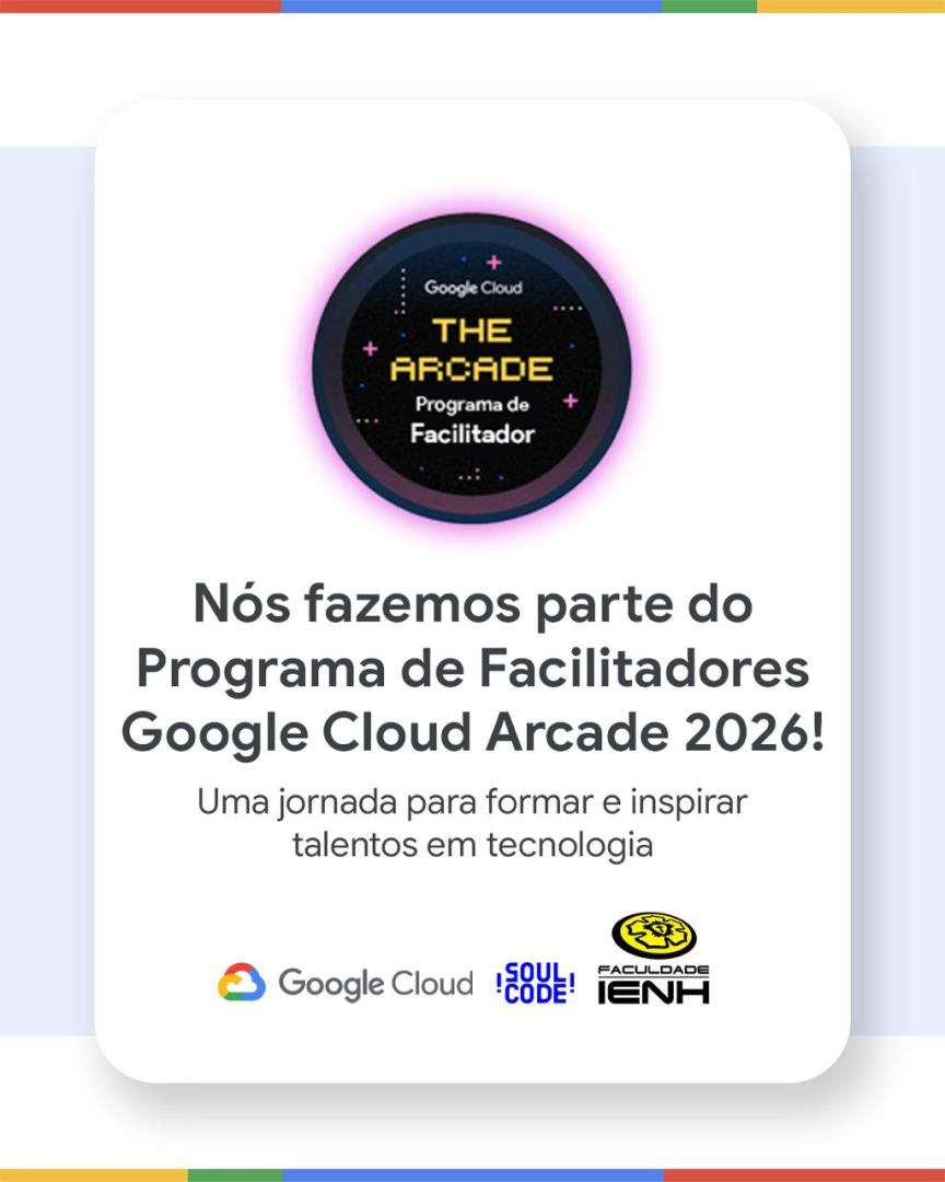 A Faculdade IENH celebra mais uma conquista no universo da educação tecnológica: a instituição foi oficialmente selecionada como Facilitadora no Programa Google Cloud Arcade 2026, uma iniciativa da Google Cloud com curadoria da Soul Code que tem como missão formar, capacitar e inspirar talentos nas áreas de tecnologia e desenvolvimento.