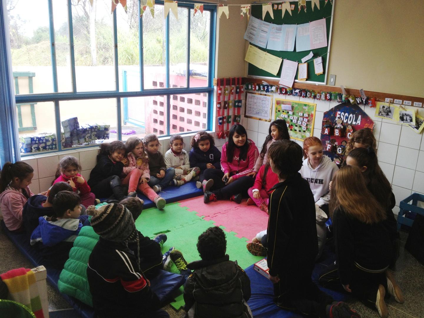 Os integrantes do GEPI aproveitaram para conhecer a escola e interagir com um grupo de alunos. Eles brincaram com as crianças e ensinaram algumas palavrinhas na Língua Inglesa, por meio de um jogo.
