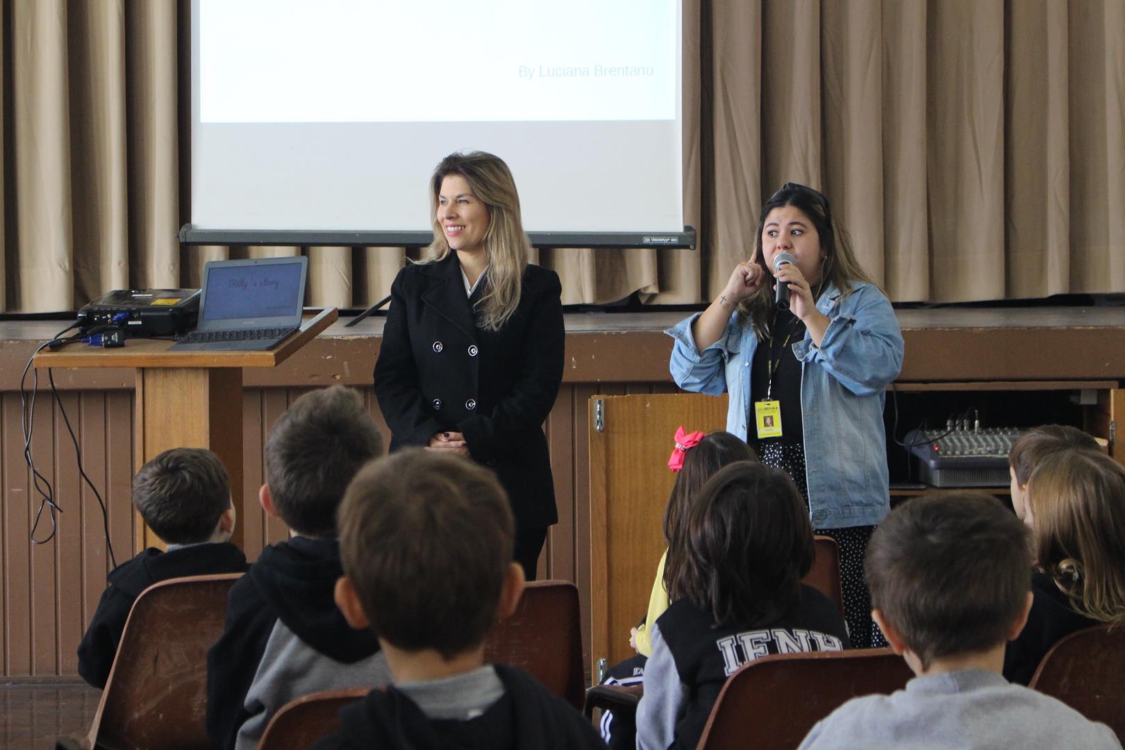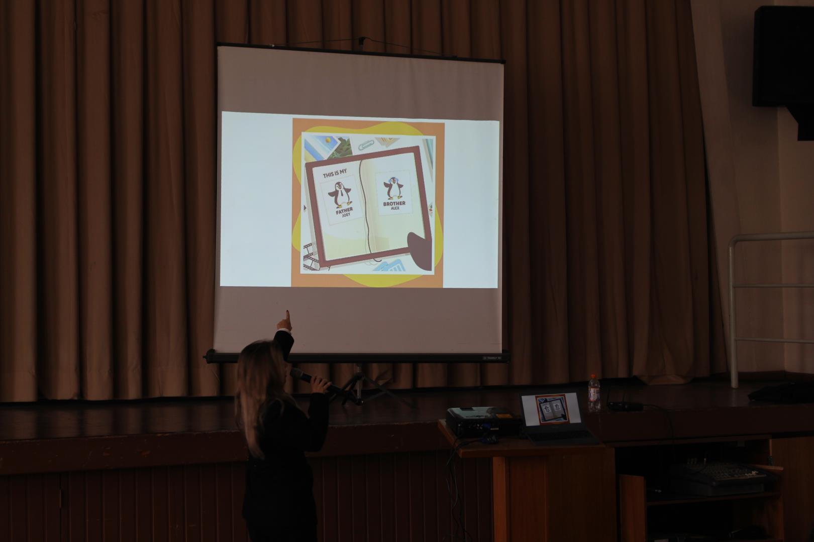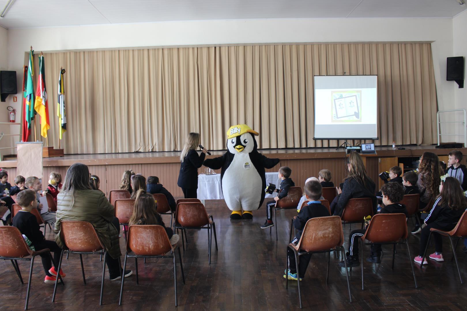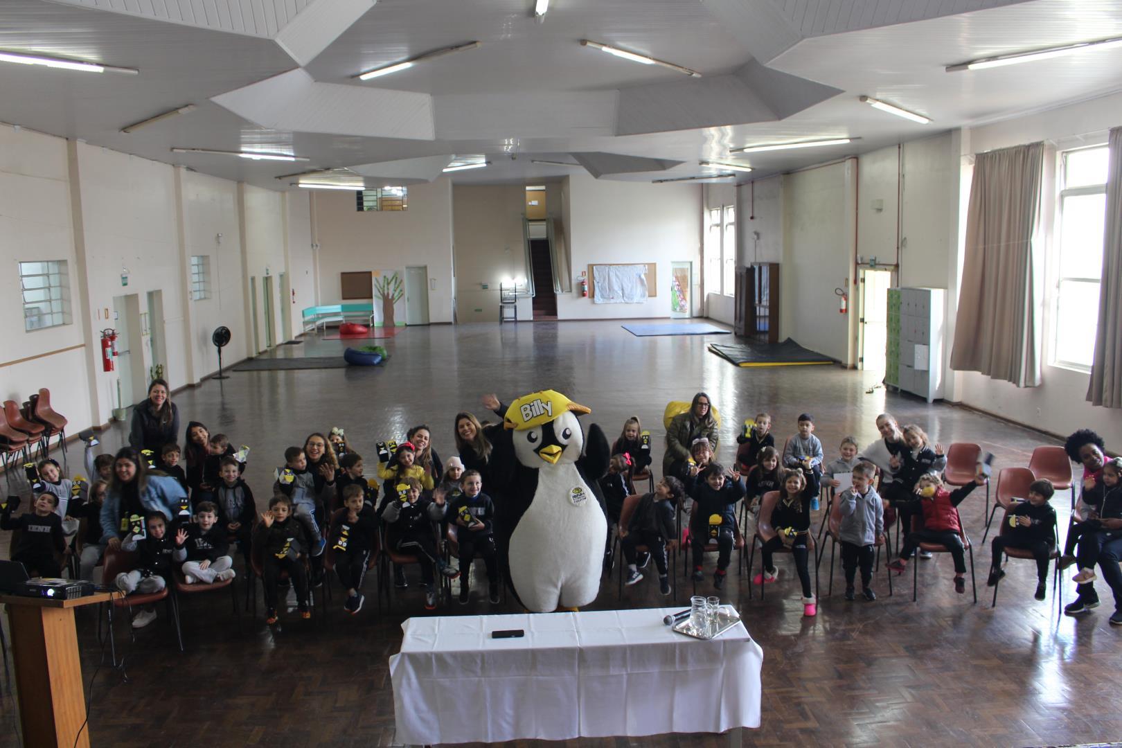O momento foi conduzido pela Coordenadora do Currículo Bilíngue, Luciana Brentano, que utilizou imagens do pinguim e sua família para ilustrar de forma lúdica a trajetória dele com a IENH. O encontro também contou com a presença do Billy, que apareceu ao fim da história, para fotos.