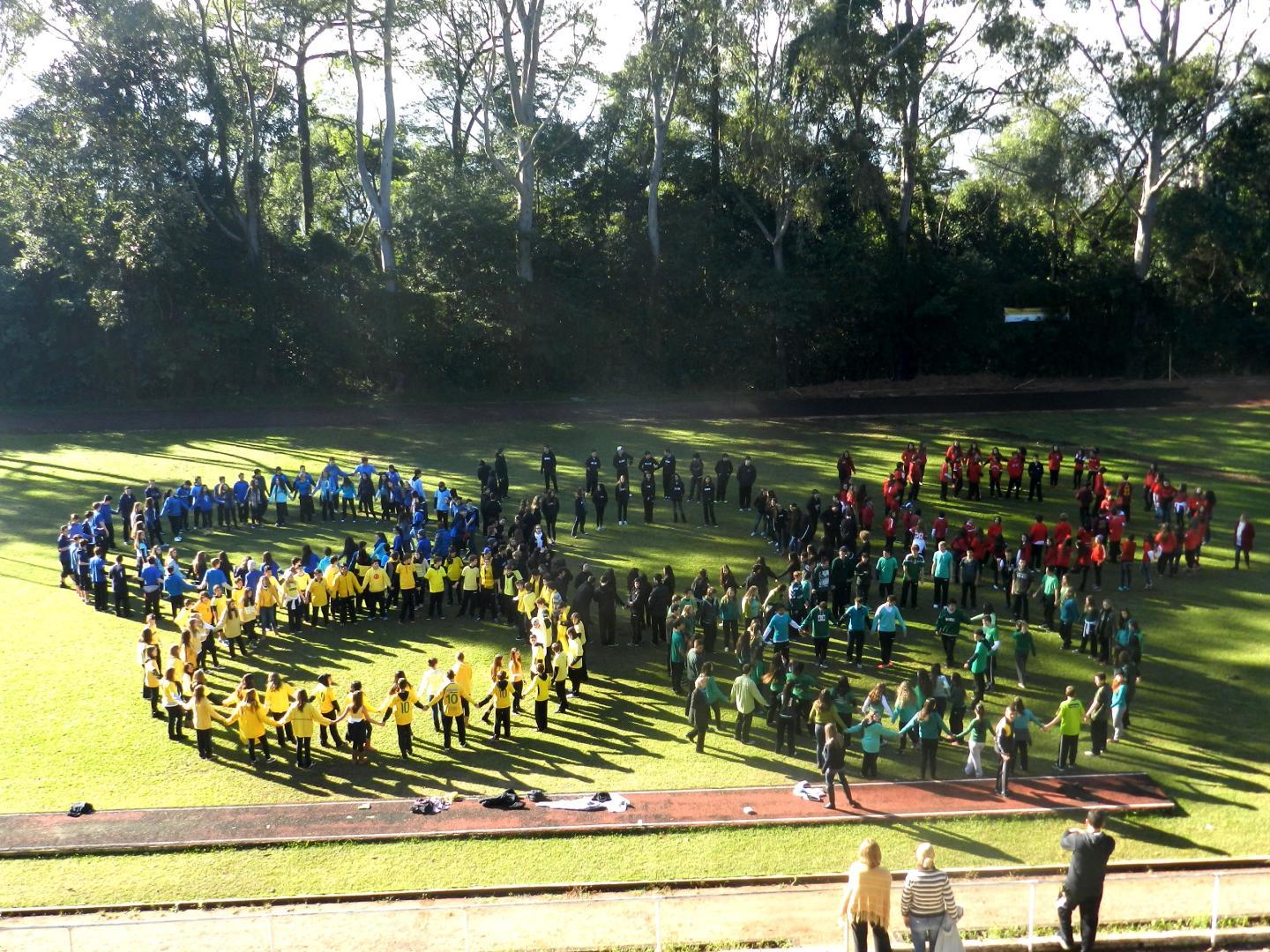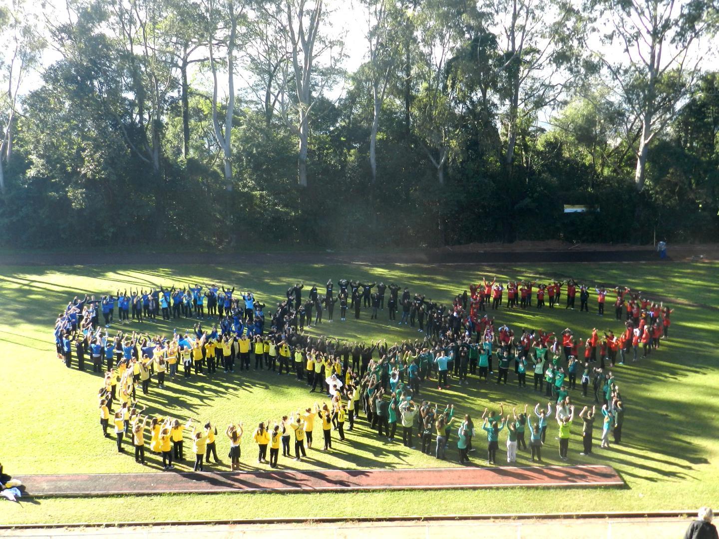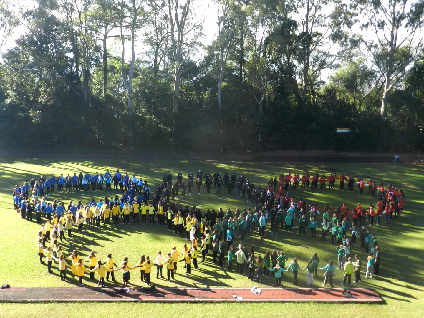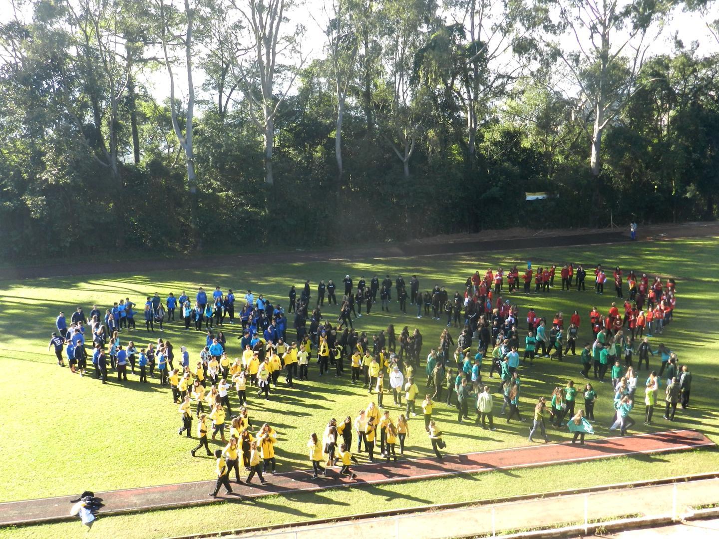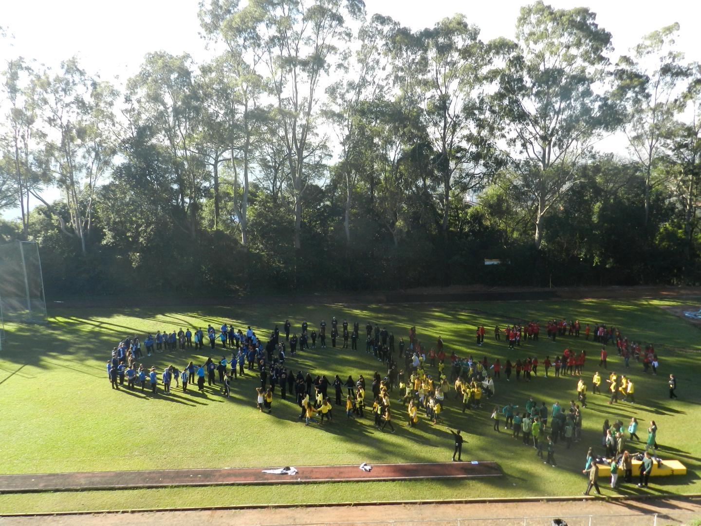 A manhã desta quarta-feira, 25 de maio, véspera de feriadão em Novo Hamburgo, foi desafiadora para alunos, professores e funcionários da Unidade Fundação Evangélica. Acompanhados pelos Professores, os estudantes vieram vestidos com roupas nas cores dos anéis olímpicos: amarelo, verde, vermelho, preto e azul. Reunidos na Pista Atlética da Instituição, local conhecido também como “Campão”, os estudantes formaram os anéis, homenageando e entrando no clima dos Jogos Olimpícos, que ocorrem a partir do dia 5 de agosto, no Rio de Janeiro – Brasil.