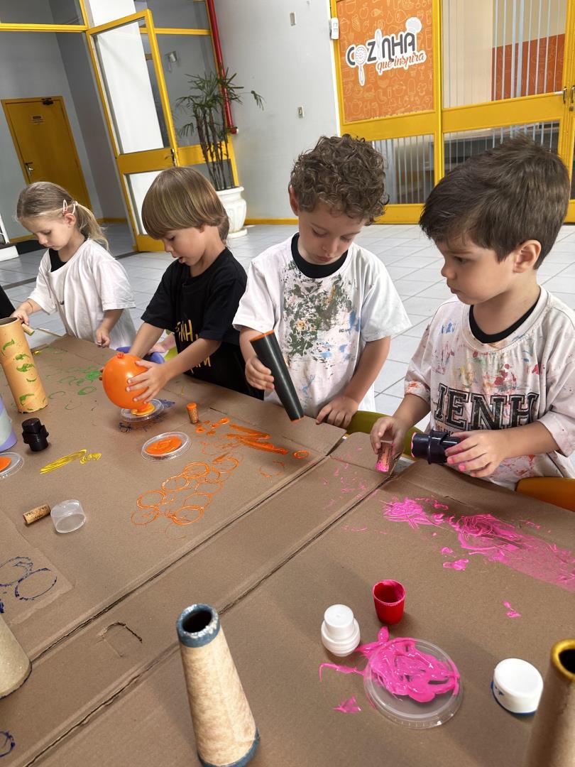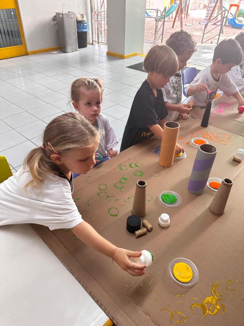 Na sequência, as turmas se deslocaram até um espaço preparado para a pintura, onde realizaram uma releitura coletiva da obra em um grande papelão. Utilizando tintas e os materiais explorados anteriormente como carimbos, as crianças criaram composições repletas de bolinhas, experimentando cores, formas e diferentes possibilidades de expressão.