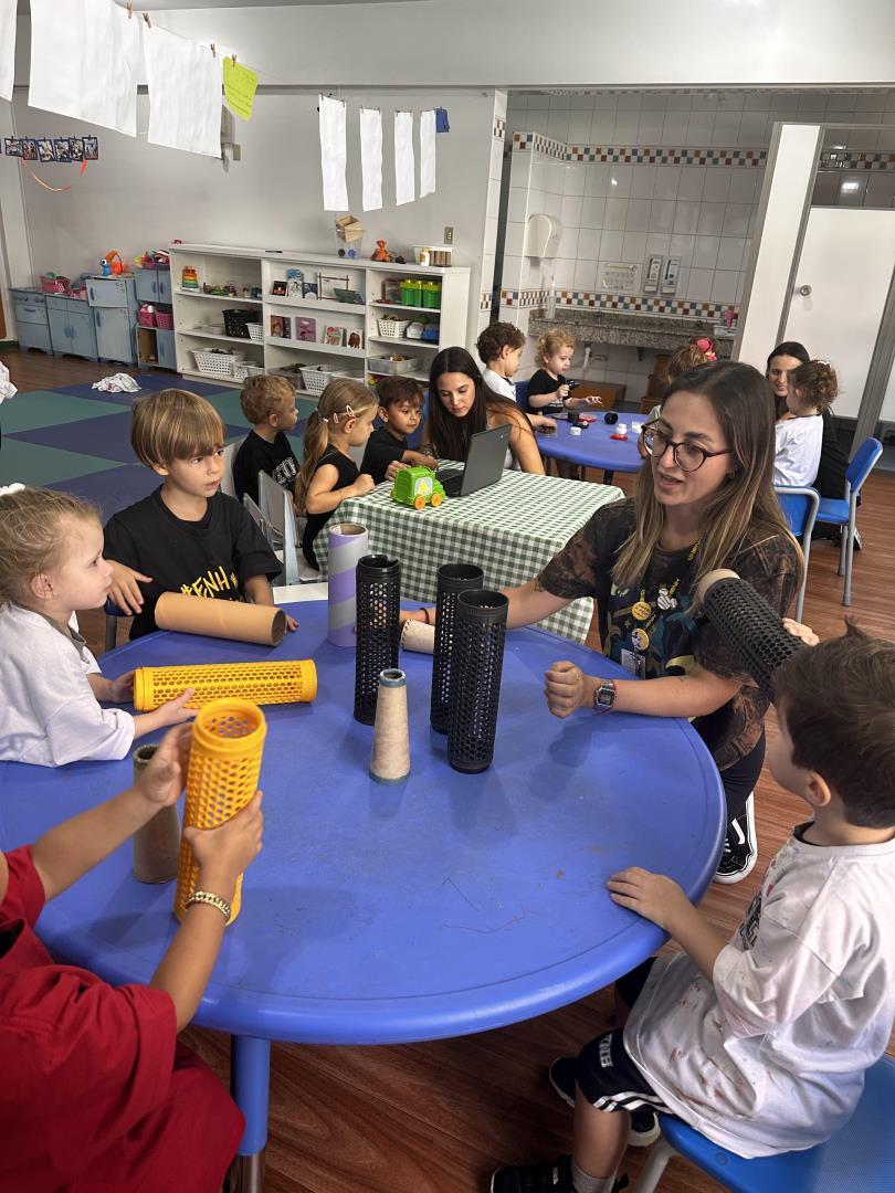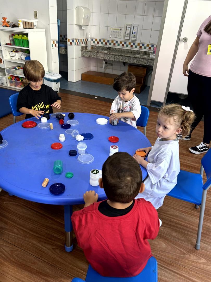 Inicialmente, as crianças participaram de um momento de Learning Center em sala de aula, explorando diferentes materiais como rolhas, tampinhas, balões e cones. Esses elementos foram observados e manipulados livremente, estimulando a curiosidade e a percepção de formas e texturas. Durante esse momento, os alunos também assistiram a um breve vídeo sobre a obra, ampliando o repertório visual e artístico.