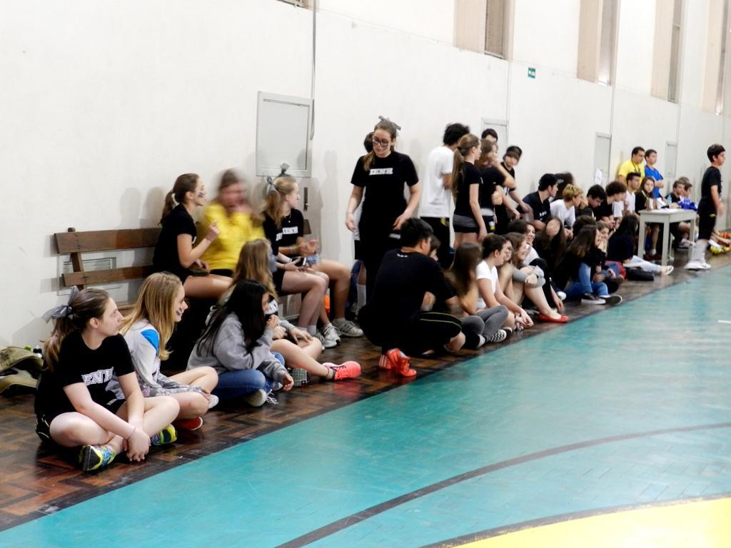 participam dos jogos de futsal masculino e basquete feminino, que estão correndo no Ginásio da Fundação Evangélica. Além da quadra, estudantes com rostos pintados e instrumentos de percussão também compõem as torcidas das equipes.