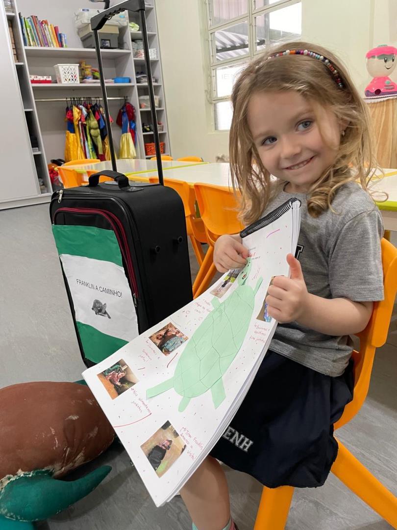 Para tornar a experiência ainda mais significativa, a turma confeccionou um mascote de pano: a tartaruga Franklin. Os estudantes participaram de todo o processo, da escolha do nome à pintura e aos preparos finais, criando um vínculo especial com o personagem que acompanhou o grupo ao longo do projeto.