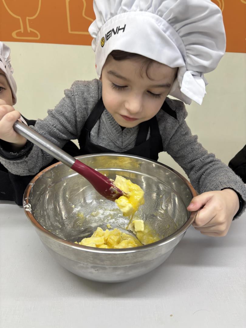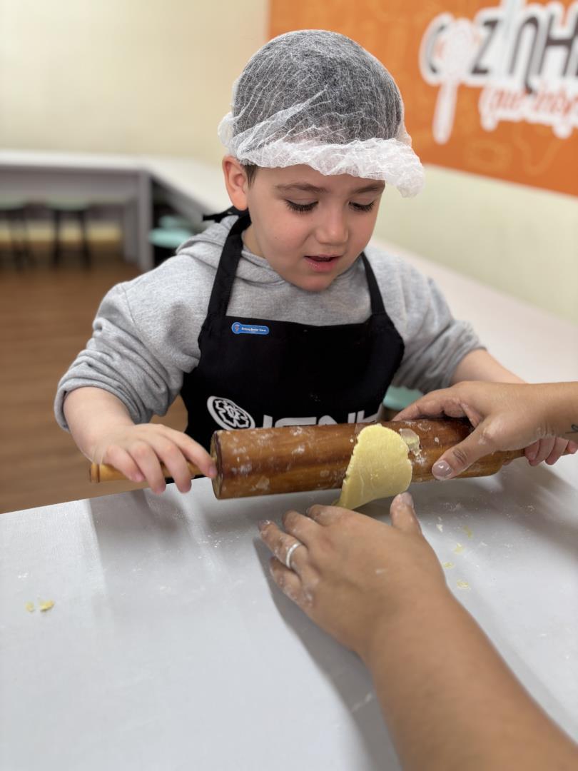 Para a abertura, os alunos participaram de uma hora do conto sobre os primeiros registros da humanidade e criaram hipóteses de símbolos utilizando giz carvão. A atividade foi acompanhada de uma deliciosa cooking class, em que produziram biscoitos amanteigados em formato das letras do próprio nome. Na sequência, levaram como tarefa de casa uma pesquisa sobre a origem e o significado de seus nomes, que foi apresentada em sala com registros, colagens e pinturas.