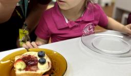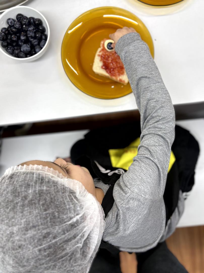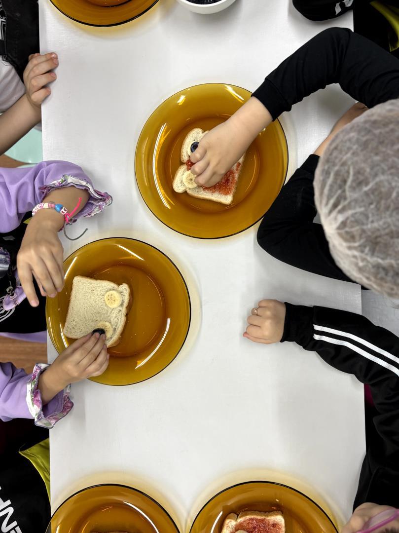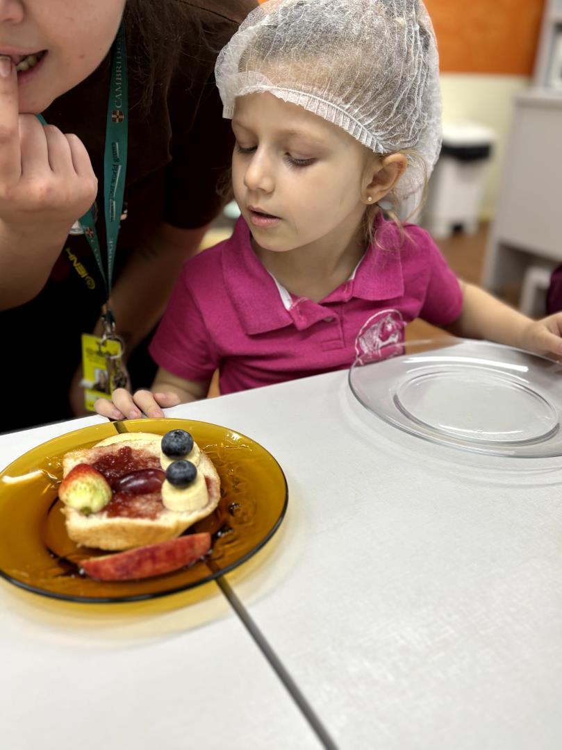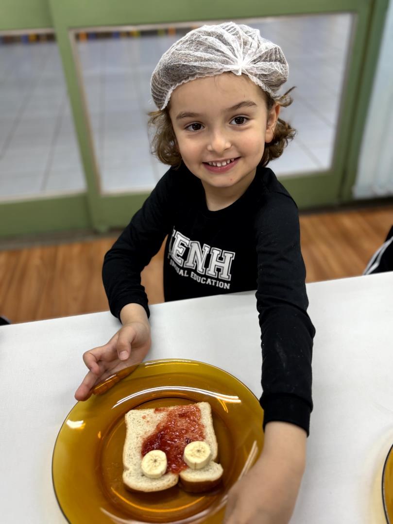Cada estudante preparou seu próprio toast, utilizando geleia como base e frutas variadas para montar rostinhos divertidos, representando expressões faciais como happy, sad e silly. As orientações foram conduzidas totalmente em inglês, o que favoreceu a compreensão e o uso prático de expressões como Put the eyes e Make a happy face.