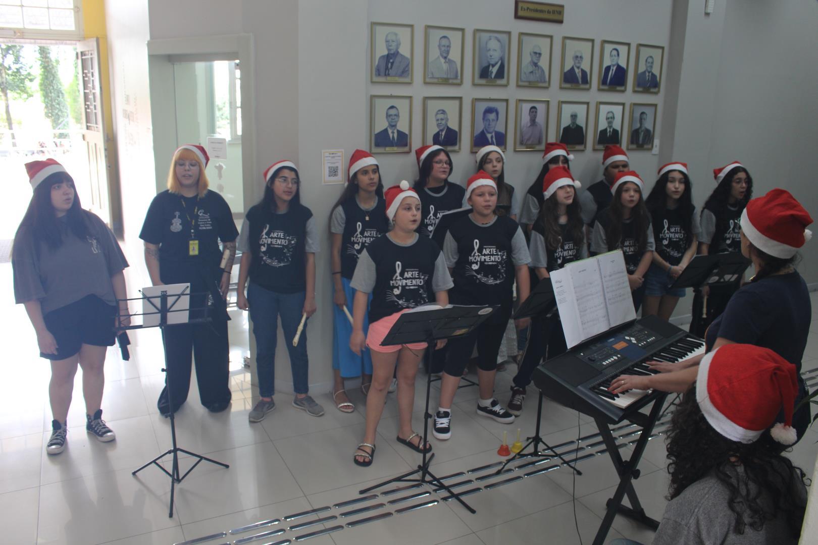 As meninas do projeto Arte em Movimento encantaram os corredores e a sala dos professores da IENH – Unidade Fundação Evangélica, na manhã do dia 3 de dezembro, com uma apresentação especial de canções natalinas. A ação, que já é tradição anual na Unidade, leva música e carinho a professores e funcionários, celebrando o espírito natalino no ambiente escolar.