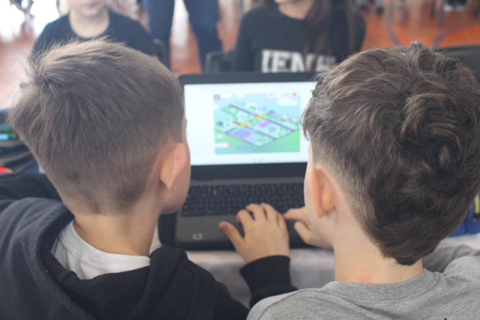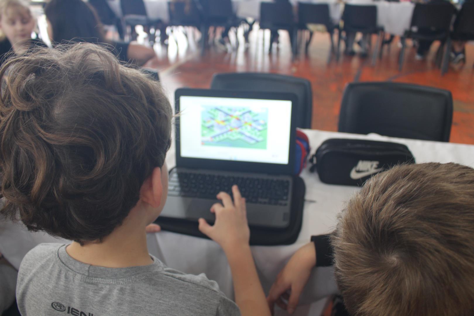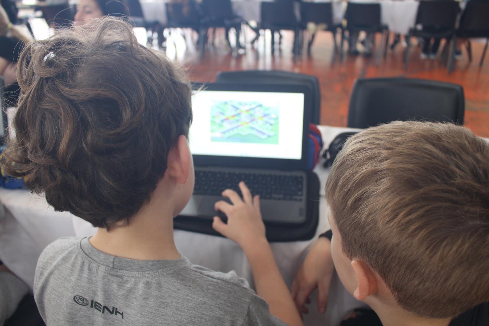 Em seguida, os estudantes foram desafiados a jogar o Gridlock Buster, um game, todo em língua inglesa, que simula a organização do fluxo de veículos e pedestres, incentivando a reflexão sobre o impacto da tecnologia no trânsito.