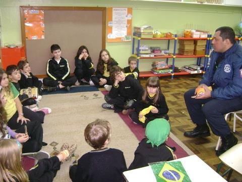 O convidado conversou com os alunos sobre questões pertinentes ao trânsito, como o uso obrigatório da cadeira para crianças nos veículos, o transporte de animais no carro e até sobre o perigo do trânsito em dias de movimentação de jogos do Brasil, como na Copa do Mundo.