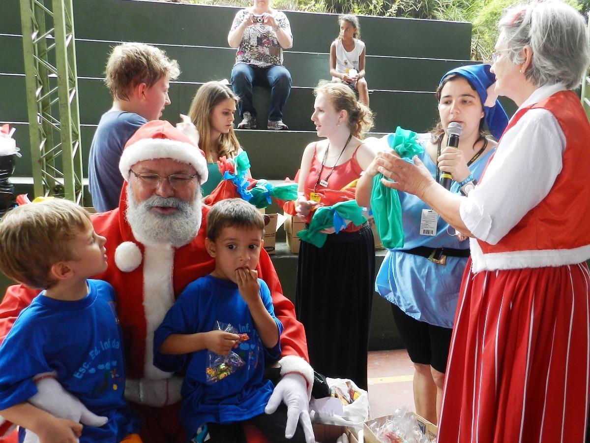 Logo após esses momentos, as crianças presentes se divertiram nos brinquedos infláveis, jogos de futebol e demais atividades disponíveis. O lanche foi seguido da presença do casal Noel que entregou presentes produzidos pelos alunos da Unidade Fundação Evangélica na Oficina do Brinquedo.