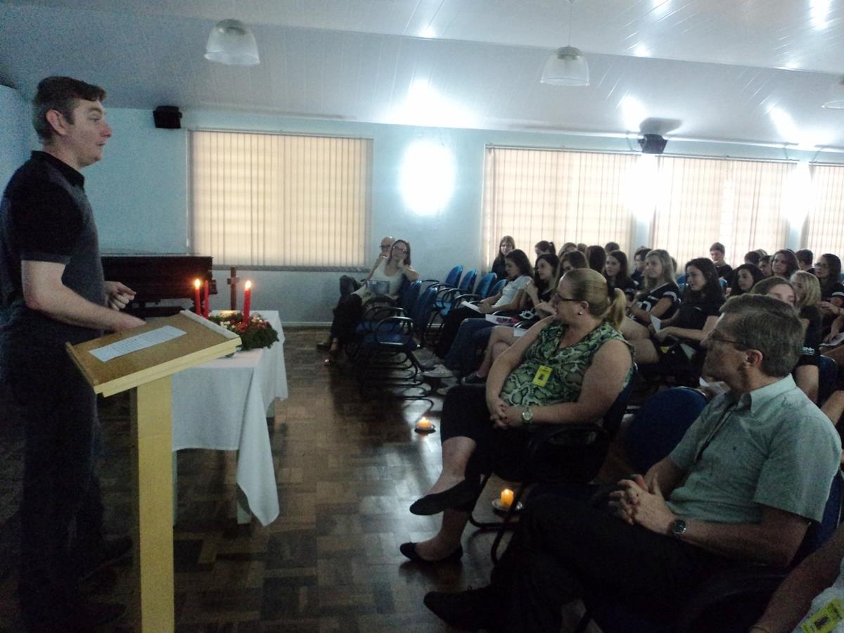 Estudantes das 8ªs séries A e B da IENH – Unidade Fundação Evangélica participaram de uma meditação de encerramento no dia 09 de dezembro. O Professor e Teólogo da IENH – Marcelo Ackermann conduziu a meditação e o protocolo. Os pais do aluno da 8ª série A, Arthur Closs Fanfa Ribas, André Fanfa Ribas e Vanéli Karine Closs Ribas foram convidados para falar com as turmas, representando todos os pais e familiares dos estudantes.