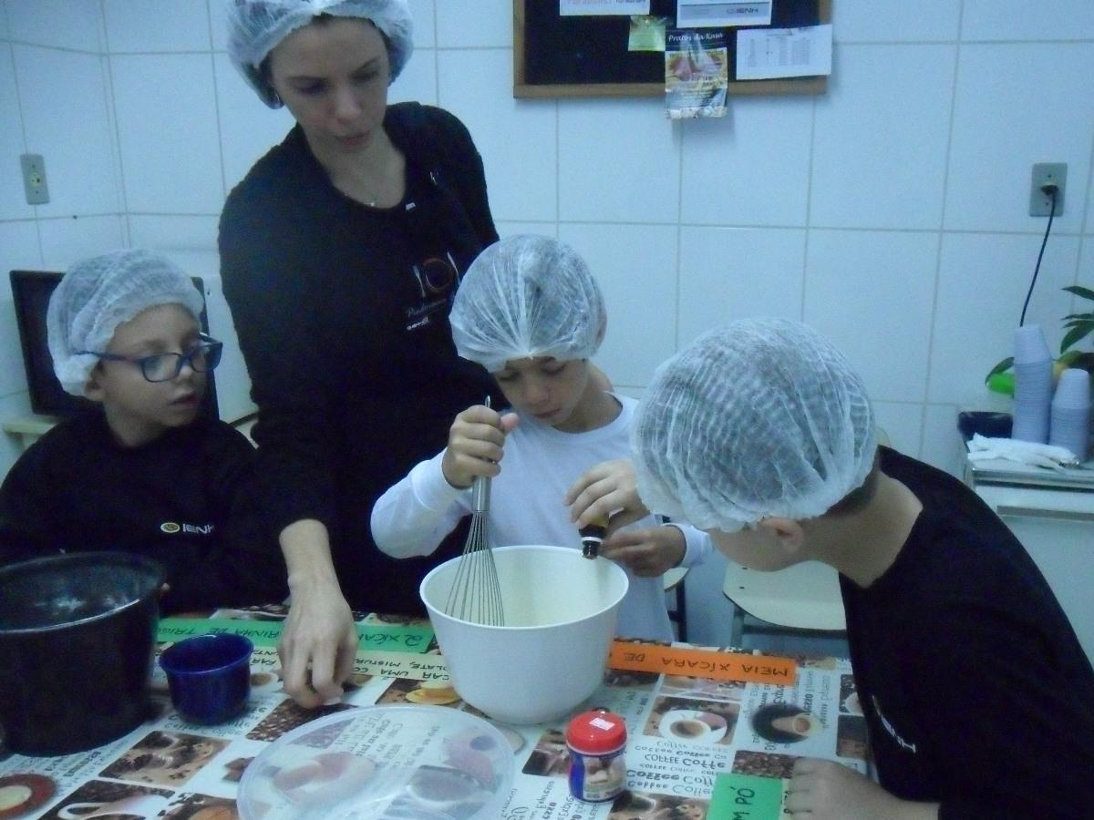 Os estudantes receberam fichas com a descrição de ingredientes e também o preparo do cupcake, lembrando do ingrediente mais especial incluído na receita, a amizade. Logo após executarem a receita, se dirigiram a sala de aula, onde através da escrita e dos desenhos registraram o momento.