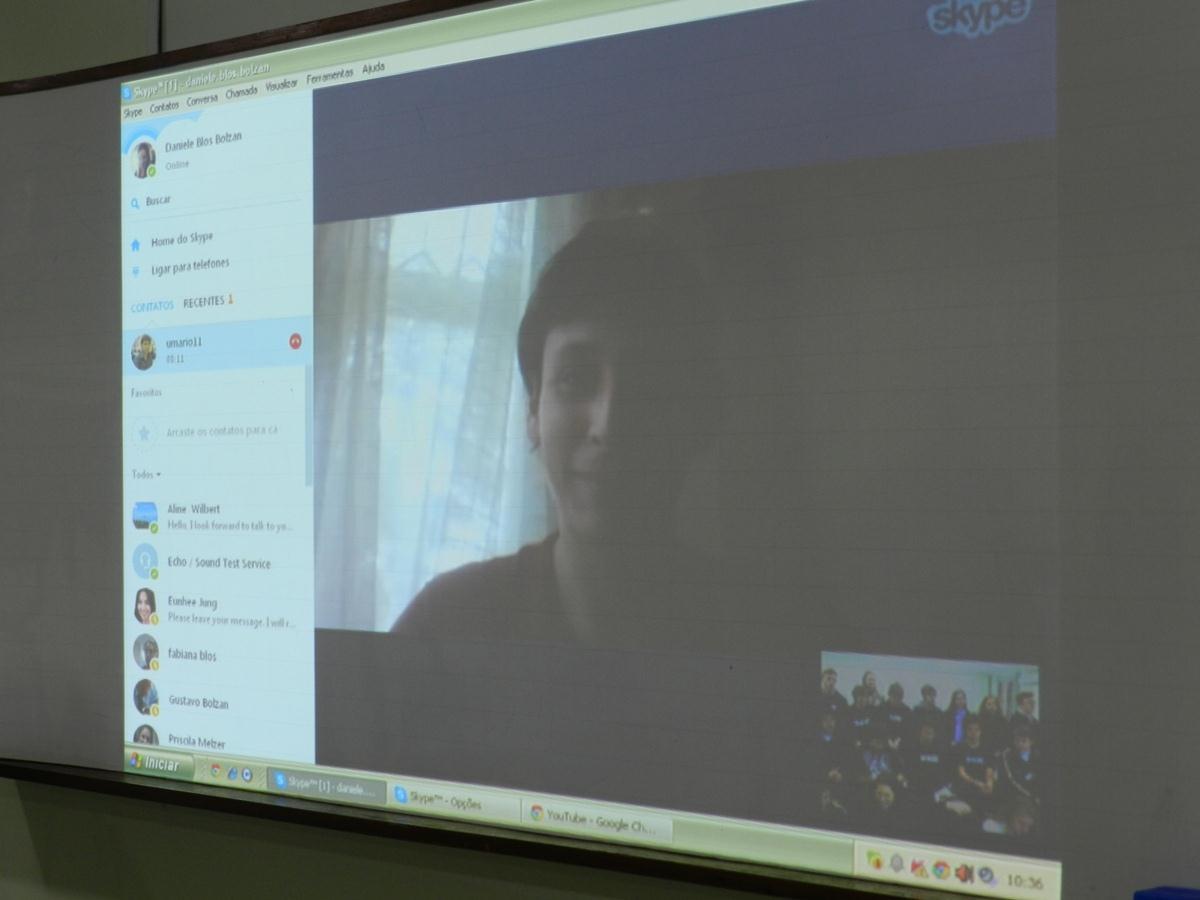Todas as atividades culminaram no encontro virtual via Skype com o canadense Mario Umana. A Professora conta que conheceu Mario quando acompanhou os alunos aos Intercâmbios de 2013 e 2014. O canadense trabalhava no Columbia College, que é a instituição onde os alunos da IENH estudam durante o programa de Intercâmbio. Na conferência virtual, os alunos conversaram com Mario sobre o dia a dia no Canadá e os assuntos dos trabalhos que anteriormente apresentaram, buscando o ponto de vista de um canadense.