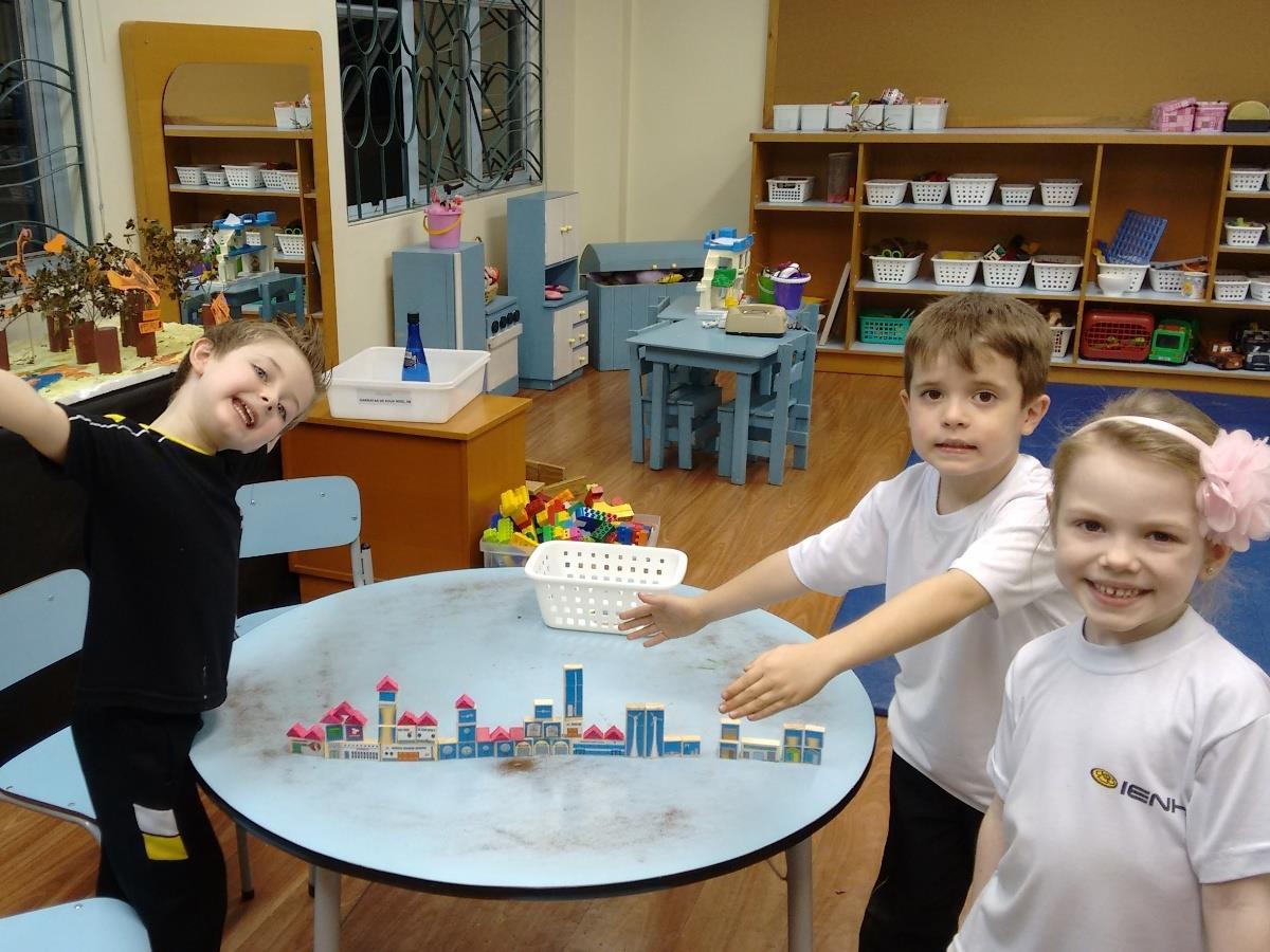 A rotina dos alunos do Nível 5B da Educação Infantil da IENH – Unidade Pindorama está repleta de brincadeiras que estimulam o aprendizado. Os diversos espaços da escola permitem que os estudantes possam brincar e imaginar, o que incentiva a capacidade criadora das crianças.