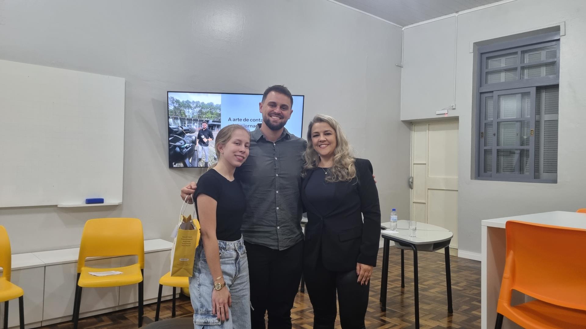 A recepção e mediação do evento foram realizadas pelas alunas Paula Vitória Justo Pereira e Paula Libiane Sperafico Schnorr, que conduziram a acolhida, os questionamentos e o encerramento da palestra. O convite ao palestrante também partiu da iniciativa da estudante Paula Vitória.