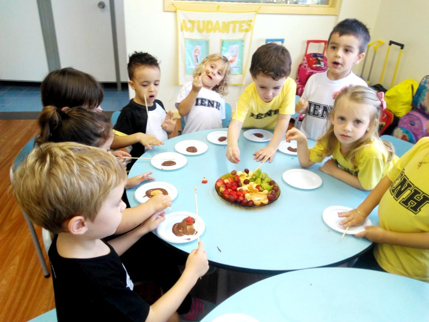 Segundo a Teacher Ana, a história do livro permitiu que diferentes atividades fossem realizadas com as turmas. Jogos de regras, brincadeiras, exploração das partes da narrativa (explorando a noção temporal e espacial), culinária com as frutas presentes na história e outras em que pudessem relatar suas cores (incentivando a alimentação saudável), mistura de cores primárias e secundárias, registro (configurando o desenho, como partes do corpo, noção de quantidade), habilidades de input e output (em que deveriam não apenas reconhecer os vocábulos, mas expressá-los - fazendo o mesmo com pequenas frases, conduzidas pela professora, que surgiram pela história). Além disso, questões culturais foram abordadas com os alunos, como o modo de dizer e as frutas que não são típicas do país. “Nessa fase, os alunos já dão conta de realizar pequenas expressões em Inglês se dirigidas e trabalhadas ao longo das aulas com intermédio da repetição e da contextualização, que surgem a partir do interesse de histórias ou cantigas”, relata a Teacher Ana.