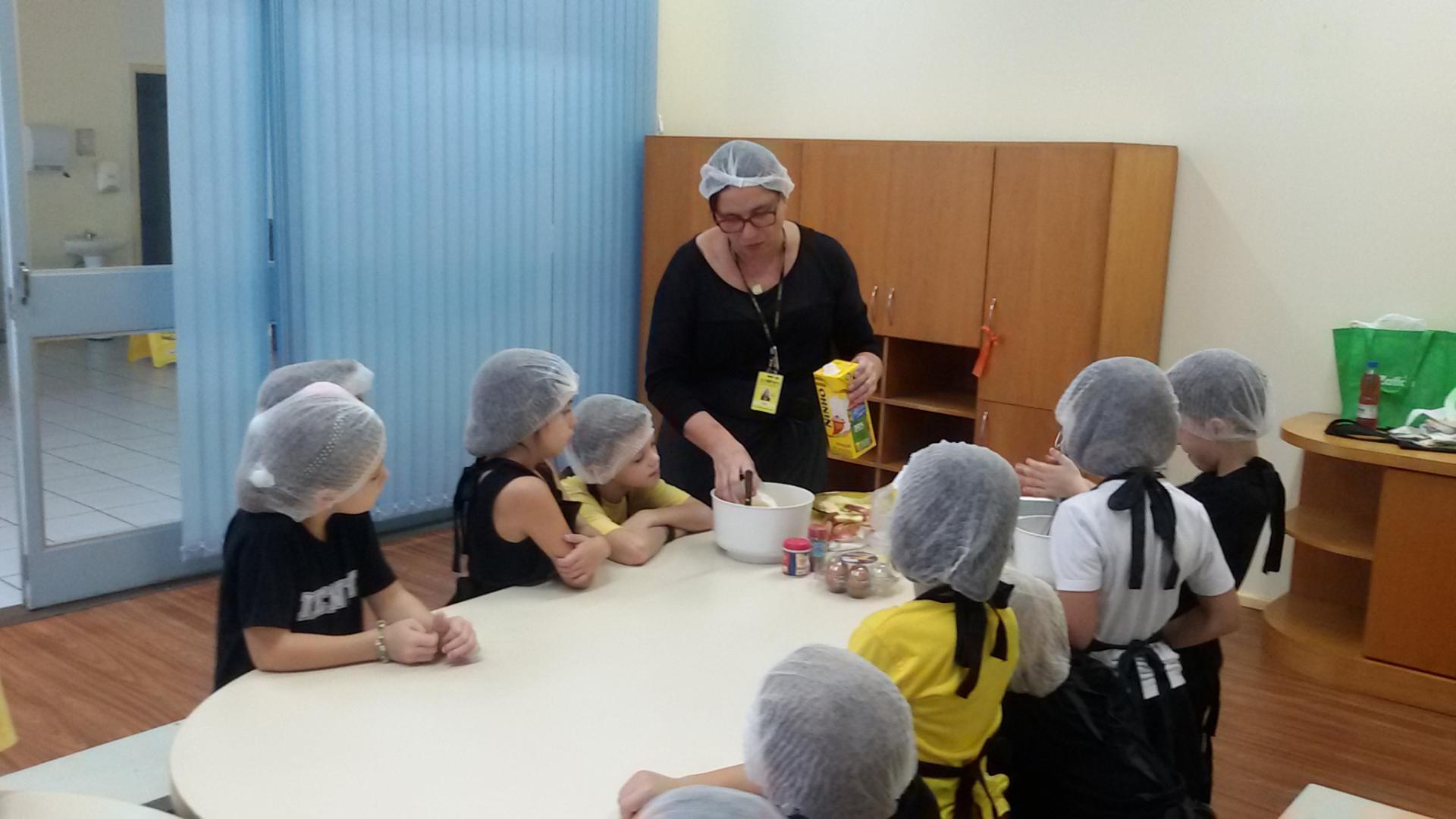 Com o acompanhamento da Professora, o grupo participou de todas as etapas do processo, desde o preparo dos ingredientes até a decoração final do bolo. Após a atividade na cozinha, eles trabalharam, em Inglês, os nomes dos ingredientes e os utensílios de cozinha necessários para preparar o bolo. Conforme a Professora, os alunos ainda, em atividade oral, demonstrarão aos demais colegas da sala como fazer o bolo, dramatizando a atividade realizada na cozinha.