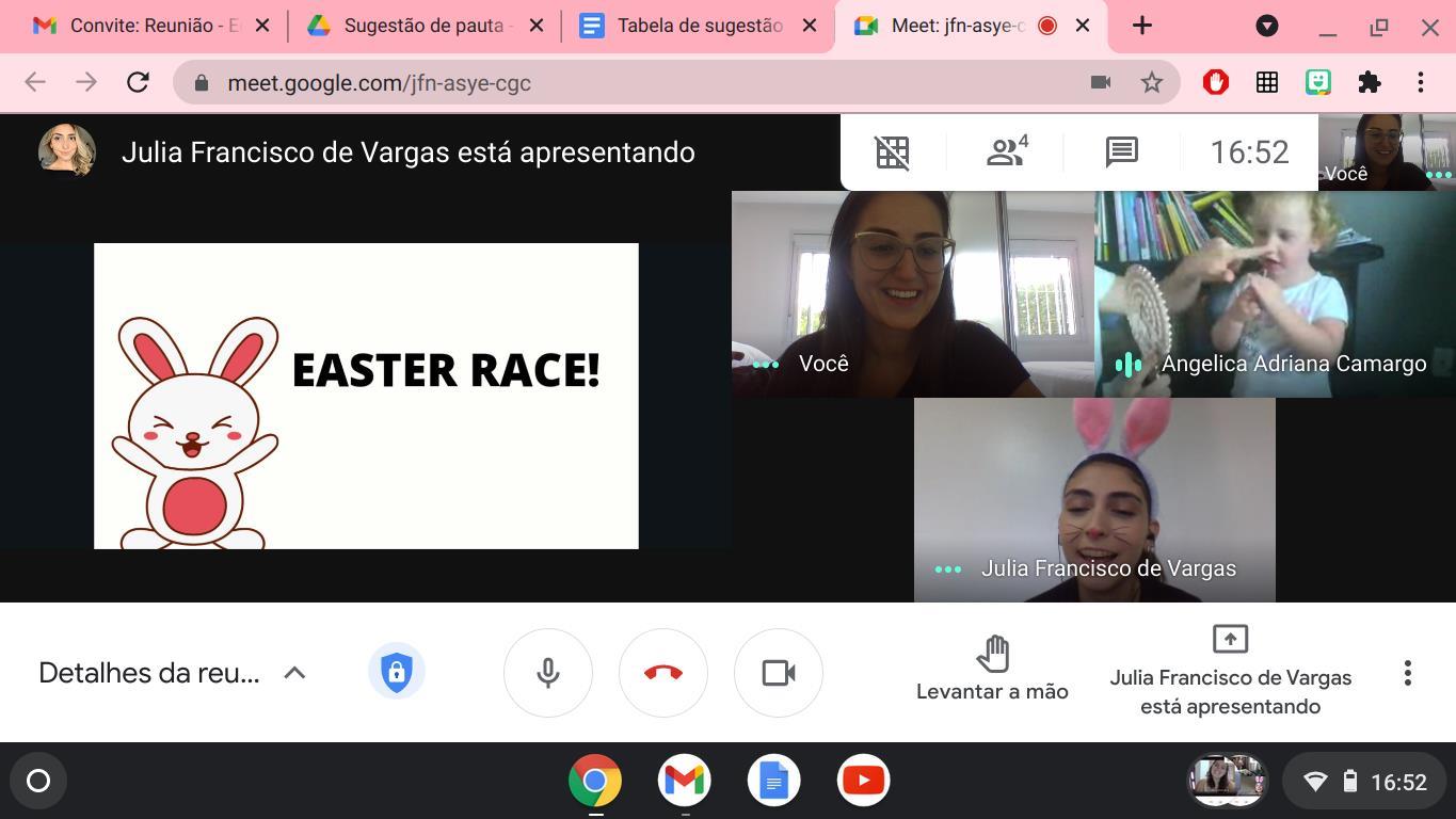 Momentos de história também fizeram parte dos aprendizados: em língua materna a turma ouviu a história “O Coelhinho que não era de Páscoa”, de Ruth Rocha, enquanto em língua inglesa "It's not easy being a bunny’’ foi contada. Músicas relacionadas com a data e a brincadeira easter race completaram os estudos.