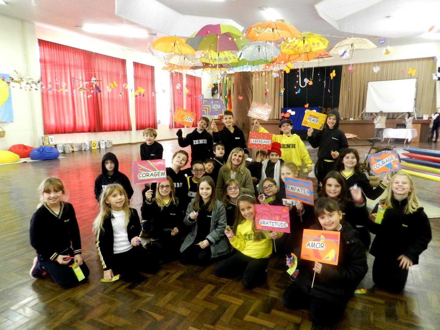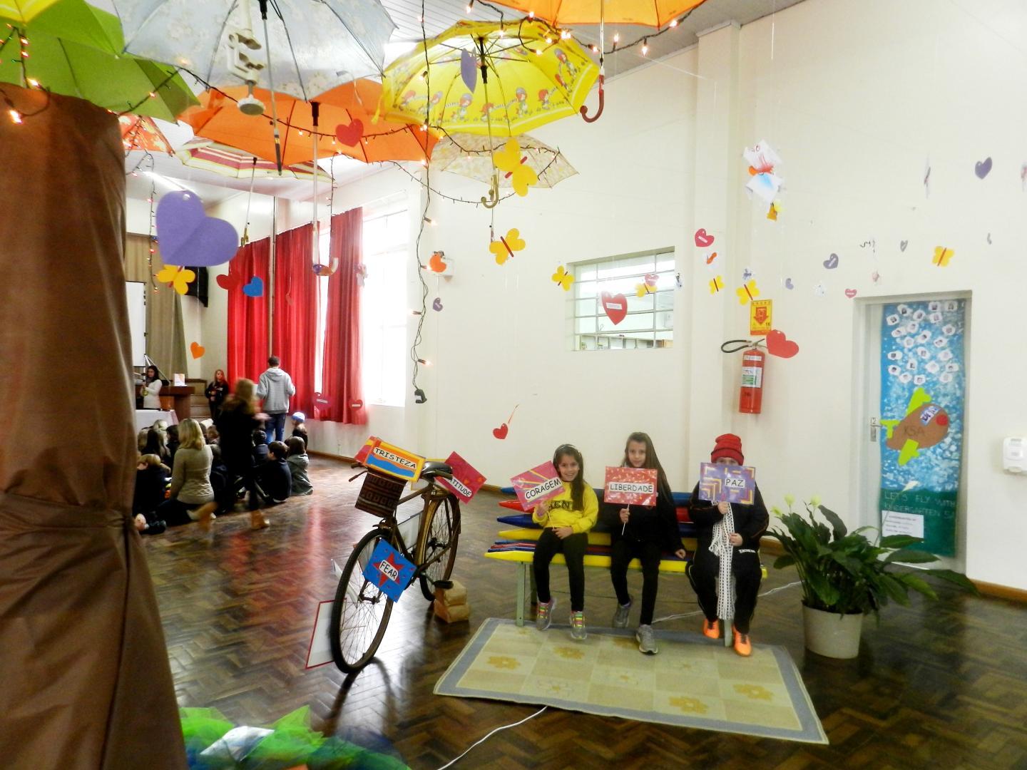 Os alunos dos Níveis 2 da Educação Infantil ao 4º ano do Ensino Fundamental participaram da contação de história com a Professora Eneida Sander, em que ouviram a história “Mil Pássaros pelos Céus” de Ruth Rocha. As turmas dos Níveis 2 e 3 e do 5º ano realizaram a visitação à feira, interagindo com o palhaço de pernas de pau.