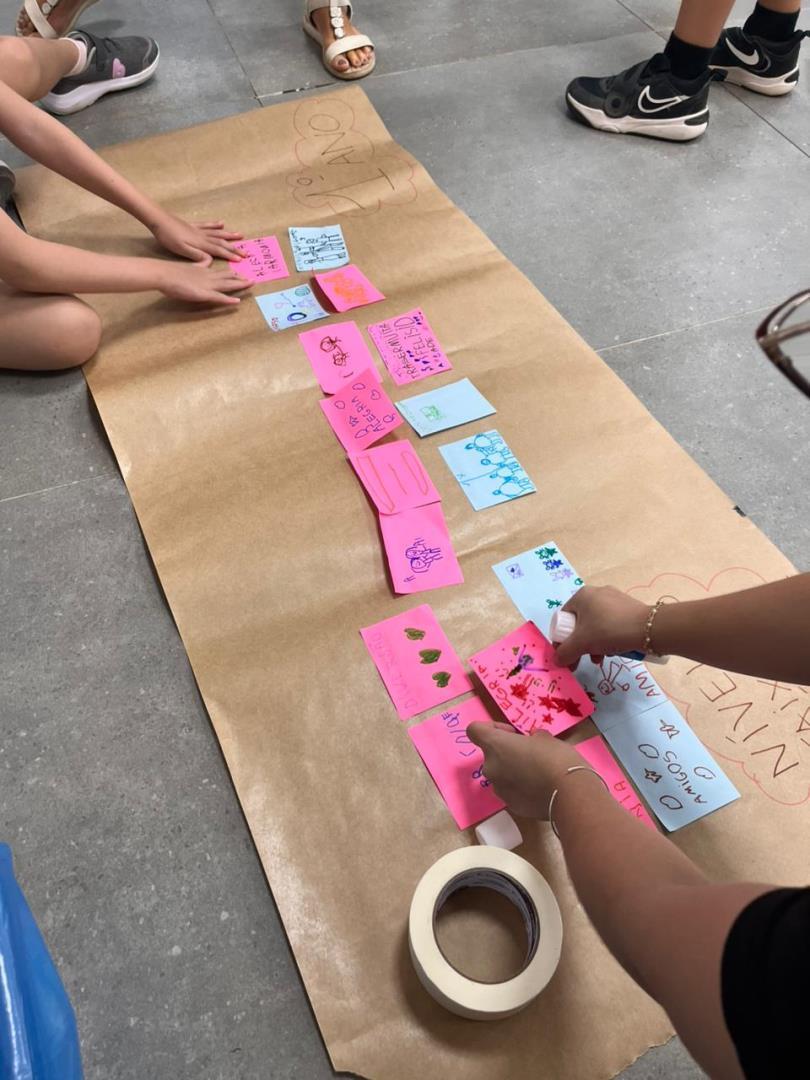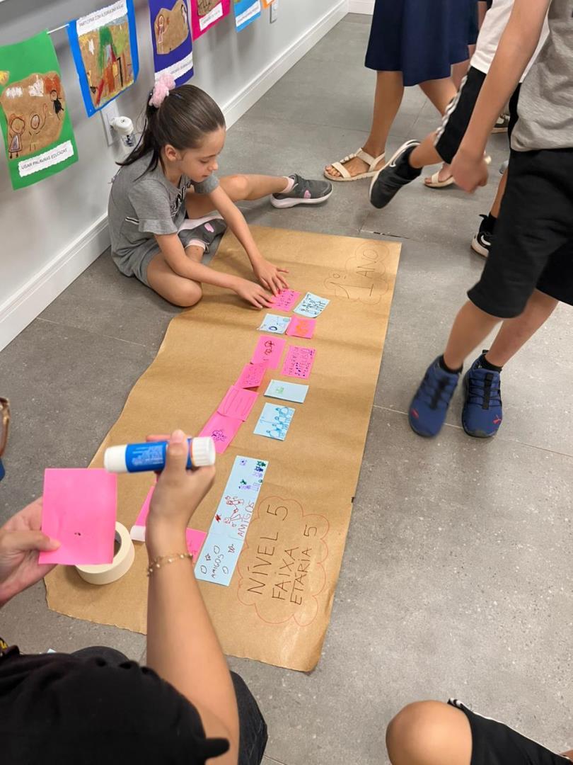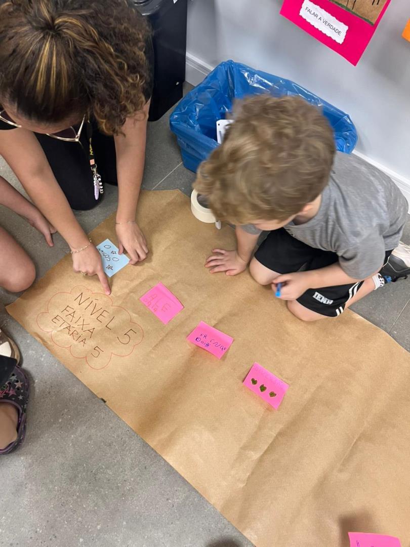 Durante a atividade, as crianças participaram de uma roda de conversa, compartilhando sentimentos, medos e expectativas sobre a nova etapa escolar. Em seguida, construíram coletivamente uma “ponte”, identificando recursos de apoio, como amigos, professores, coragem e a própria capacidade de pedir ajuda, reforçando a percepção de que não precisam enfrentar desafios sozinhos.